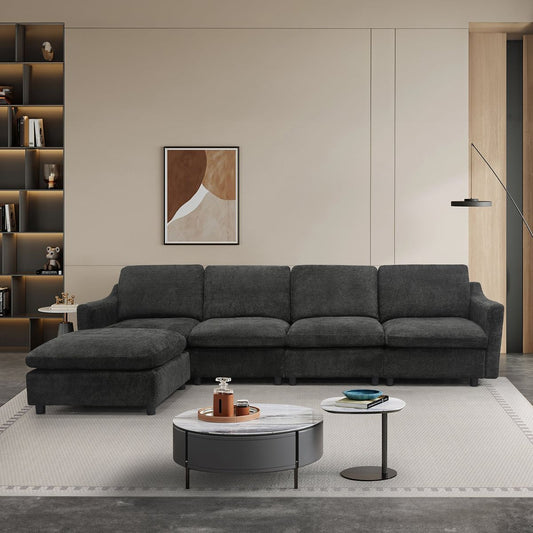 Modern Home Living Room L-Shaped Sectional Sofa Couches with Ottoman, Convertible Oversized 4 Seater Couch Towel Fabric, Black