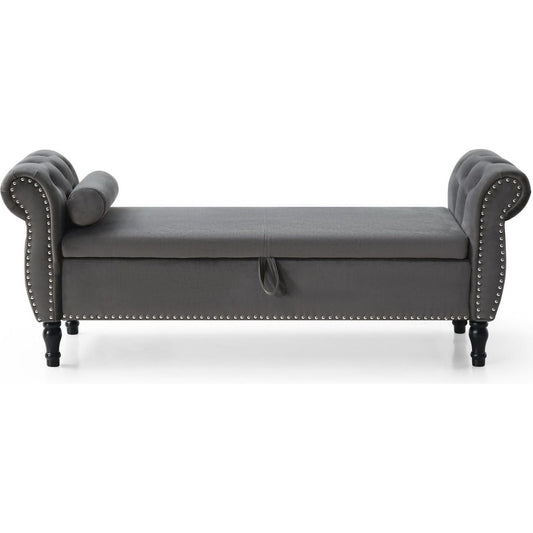 63" Velvet Multifunctional Storage Rectangular Sofa Stool Buttons Tufted Nailhead Trimmed Solid Wood Legs with 1 Pillow, Grey