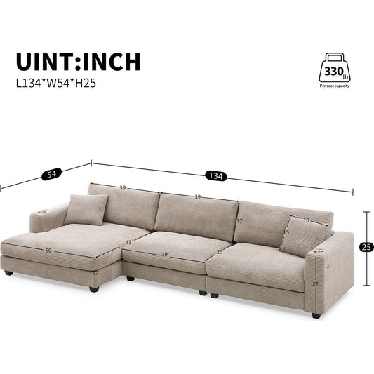 [VIDEO+NEW]134*54' Oversized Corduroy Sectional Sofa,L Shaped Cloud Couch with USB Charging Port,Cup Holder,Deep and Wide Seat Sofa with 50' Chaise,Comfy Indoor Furniture for Living Room,3 Colors
