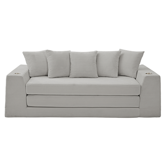 [NEW ARRIVED] [VIDEO PROVIDED] 82.25' Convertible Sofa Bed,Loveseat ,2 in 1 Sofa, Corduroy Pull Out Sofa Bed , 5 Pillows , Side Pocket,No Assembly,Bring Two Cup Holders,Wide Armrest,3 Seat,Light Gray