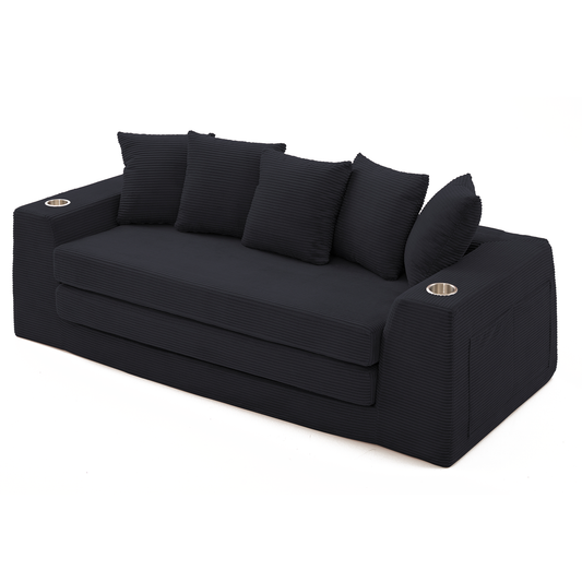[NEW ARRIVED] [VIDEO PROVIDED]82.25' Convertible Sofa Bed,Loveseat Sleeper Sofa,2 in 1 Sofa, Corduroy Pull Out Sofa Bed,5 Pillows , Side Pocket,No Assembly, Two Cup Holders,Wide Armrest,3 Seat,Black