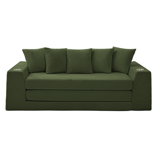 [NEW ARRIVED] [VIDEO PROVIDED] 82.25' Convertible Sofa Bed,Loveseat Sleeper Sofa,2 in 1 Sofa, Corduroy Pull Out Sofa Bed,5 Pillows , Side Pocket,No Assembly, Two Cup Holders,Wide Armrest,3 Seat,Green
