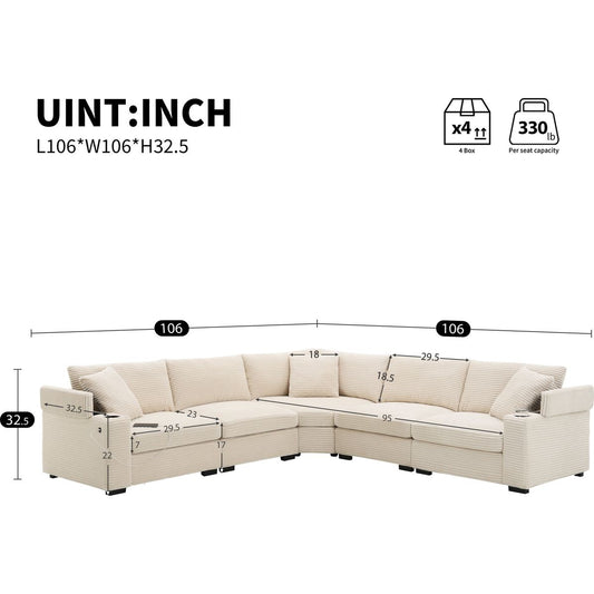 L-shaped 4-seater 105.5''*66.5'' corduroy sofa, large storage armrests with center console, USB charging, left and right seats can be switched, 2 packages of 130