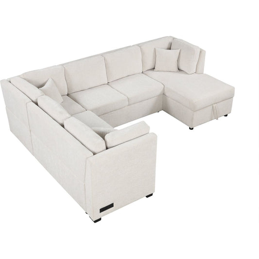 108.6' U-shaped Sectional Sofa Pull out Sofa Bed with Two USB Ports, Two Power Sockets, Three Back Pillows and a Storage Chaise for Living Room, Beige