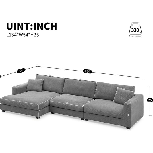 [VIDEO+NEW]134*54' Oversized Corduroy Sectional Sofa,L Shaped Cloud Couch with USB Charging Port,Cup Holder,Deep and Wide Seat Sofa with 50' Chaise,Comfy Indoor Furniture for Living Room,3 Colors