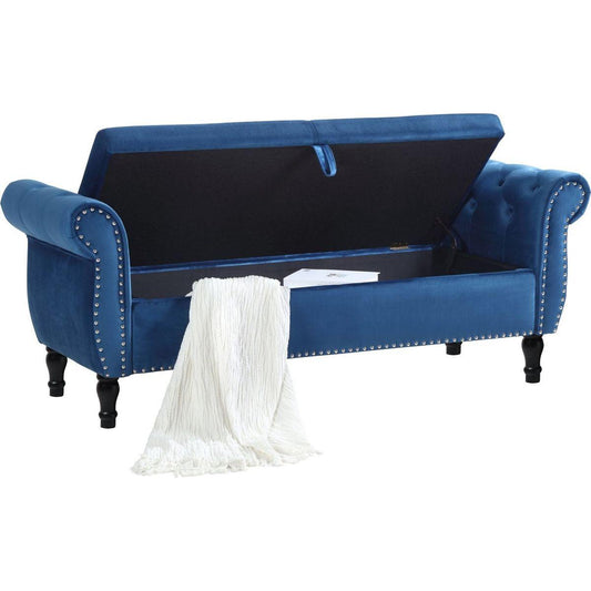 63" Velvet Multifunctional Storage Bench Rectangular Sofa Stool Buttons Tufted Nailhead Trimmed Ottoman Solid Wood Legs with 1 Pillow, Blue