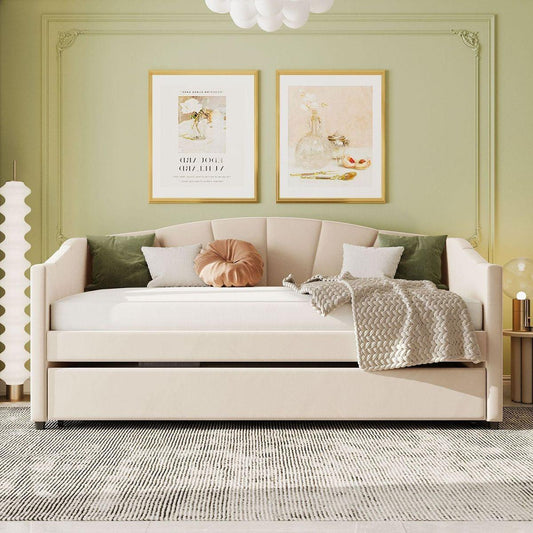 Upholstered Daybed Sofa Bed Twin Size With Trundle Bed and Wood Slat, Beige