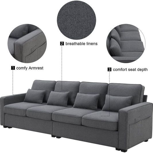 104" 4-Seater Modern Linen Fabric Sofa with Armrest Pockets and 4 Pillows,Minimalist Style Couch for Living Room, Apartment, Office,3 Colors