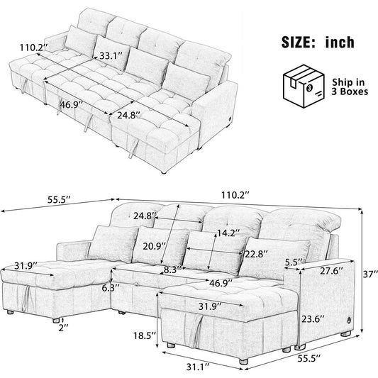 109.9' Sectional Sofa Versatile Sofa Bed Sofa Sleeper U-shaped Sofa with Ample Storage Space, Two Cup Holders and Charging Ports for Living Room, Beige