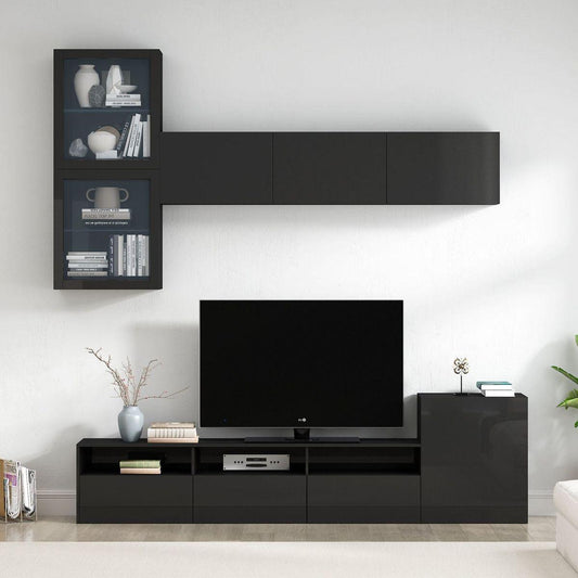 High Gloss TV Stand with Ample Storage Space, Media Console for TVs Up to 75", Versatile Entertainment Center with Wall Mounted Floating Storage Cabinets for Living Room, Black