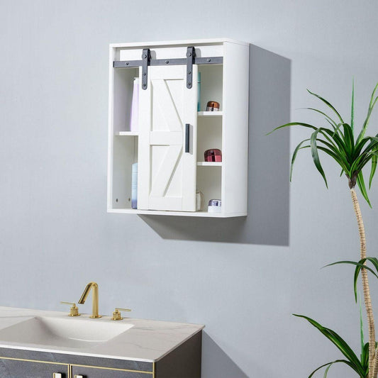 Over The Toilet Storage Cabinet, Bathroom Shelves Over Toilet with Sliding Barn Door,Adjustable Shelves and Side Storage Rack-White