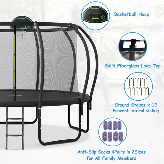 12FT Trampoline for Kids with Upgraded ArcPole and Composite TopLoop for Safety Enclosure, Plus Basketball Board and 10 Ground Stakes, Outdoor Recreational Playset Balance Physical Training Trampoline