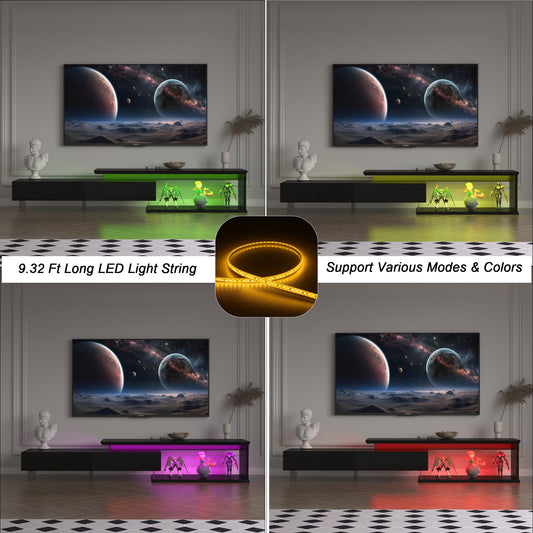 TV Console with Storage Cabinets, Extendable LED TV Stand with Remote Control, Multiple Modes Changing Lights Modern Entertainment Center with Chamfer Edge Shape, Black