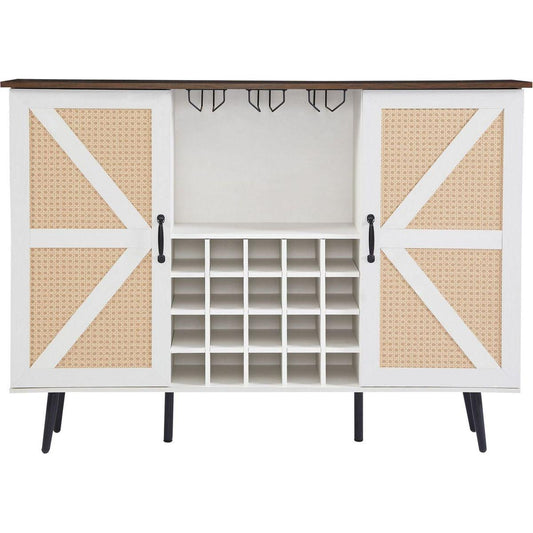White Faux Rattan Barn Door Wine Cabinet with Wine Rack and Wine Glass Rack, Double Door Design with Removable Shelves, Rustic Wood Storage Cabinet