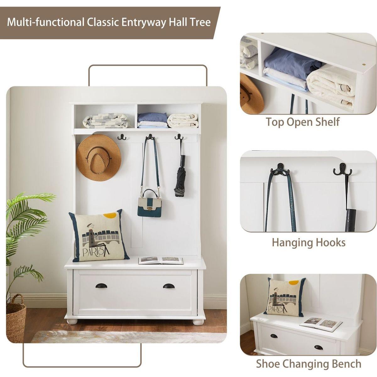 - [Practical 4-in-1 Design] This classic entryway hall tree offers shoe bench, large storage compartment, coat rack, and open shelves in a beautiful 4-in-1 package. You can effortlessly organize your entryway space without purchasing multiple pieces of furniture.