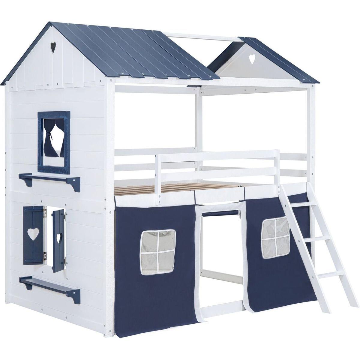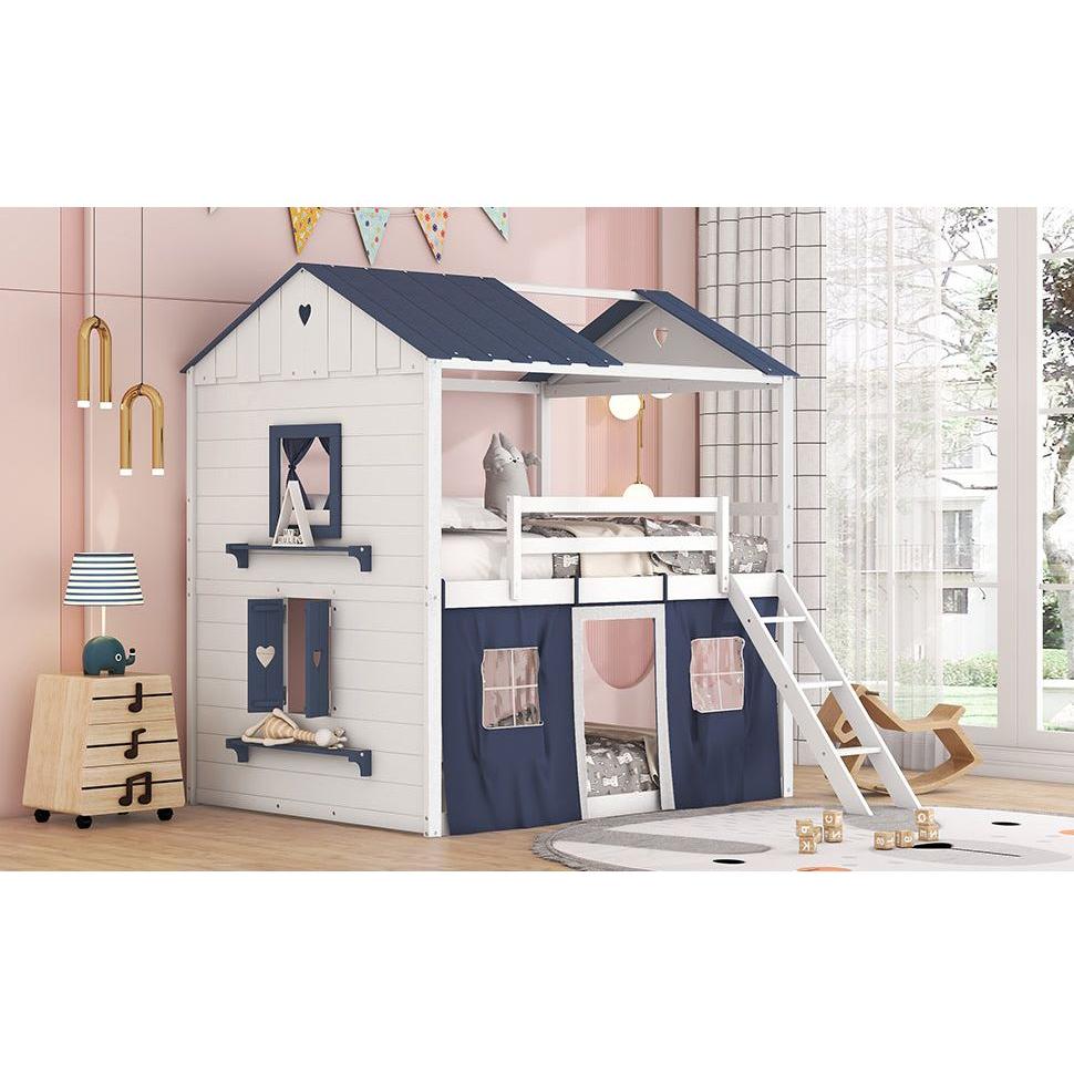Full Size Bunk Wood House Bed with Elegant Windows, Sills and Tent, Blue+White