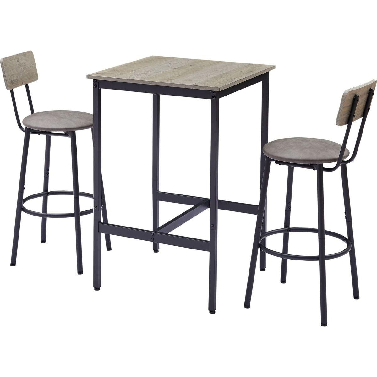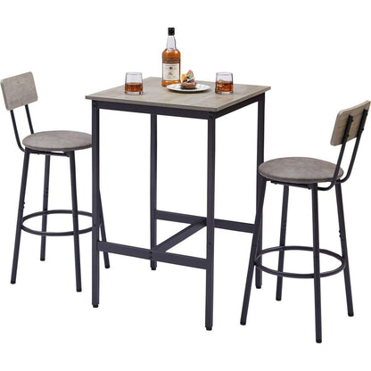 Bar Table Set with 2 Bar stools PU Soft seat with backrest, Grey,23.62’’w x 23.62’’d x 35.43’’h Package Contents: •1 x Bar Table •2 x Bar Stool •1 x Assembly Kit •1 x Instructions Product Description • The bar stool is equipped with a 13.4 inch wide PU upholstery, the seat cushion is about 24.41 inches from the floor, a ring-shaped footrest and a wooden backrest, with a soft touch, you can lean on the backrest comfortably. •Two stools can be placed under the table when not in use, it will not obstruct your passage, while keeping it clean and beautiful, it is very suitable for small spaces. Suitable for living room, dining room, kitchen, study, bar and other places. •The bar table and chairs are composed of sturdy iron frame and high-quality particle board (0.6 inches thick), carrying capacity: table: 300LBS. Stool: 350LBS. •Rustic brown particleboard and high-quality black iron frame create a minimalist style, while the PU upholstered seat gives an industrial feel and comfort. • It can create a resting space for you anywhere at home. You can pull the chairs out from under the table at any time and have a drink with family and friends, which will make you feel the relaxed atmosphere and have a good time.