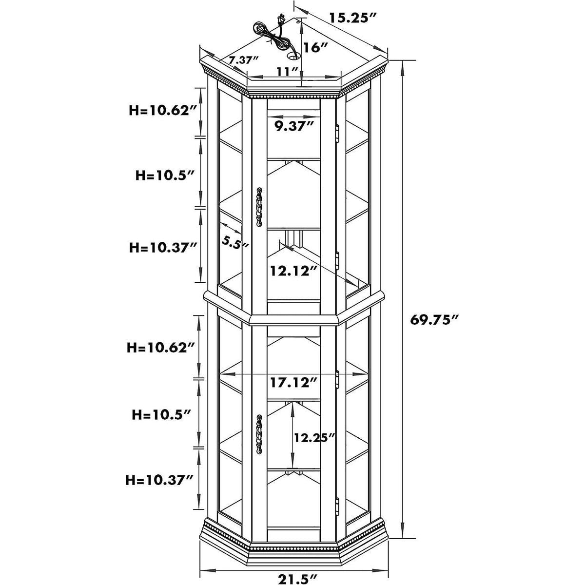 - Adjustable Shelves:This lighted corner curio cabinet offers 2 fixed shelves and 4 tempered glass shelves, which is best for valuable or fragile items.The tempered glass shelves can also be removed if you would like to display taller items. Overall Dimensions: 69.75"H x 21.5"W x 16"D, Holds up to 150 lbs. Each of the shelves can hold up to 25 pounds of distributed weight.