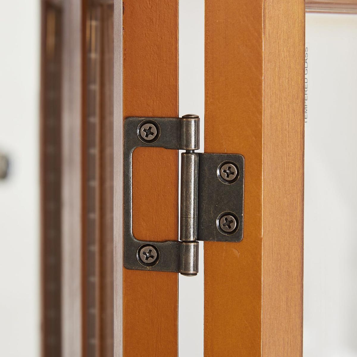 - Durable and Safe: Curio cabinets with glass doors and shelves is crafted from high quality engineered wood and has a natural walnut finish that shows off the wood's unique grain color variation. Classic engraved beading and ornamental brass handles to create a crisp contrast we love. Wood-framed tempered glass doors provide a secure and dust-free interior and anti-dumping belts ensure the stability of the cabinet.