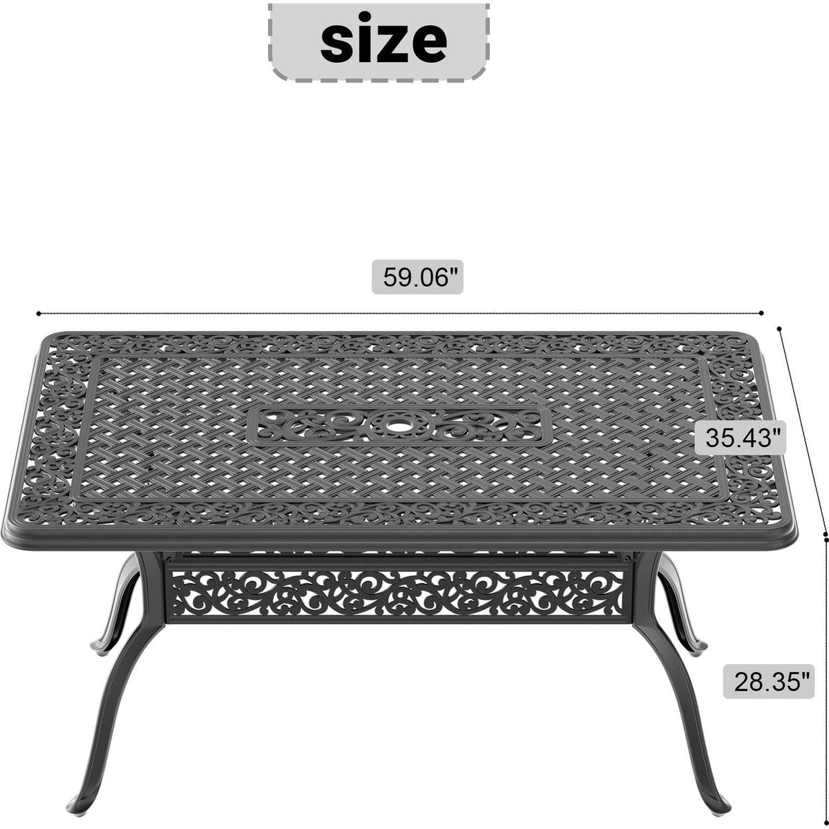 L59.05xW35.43-inch Cast Aluminum Patio Dining Table with Black Frame and Umbrella Hole