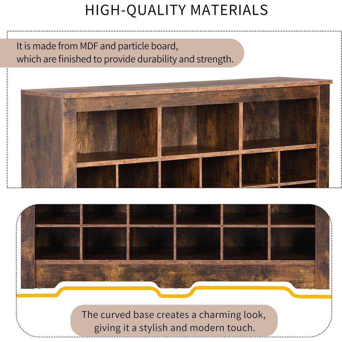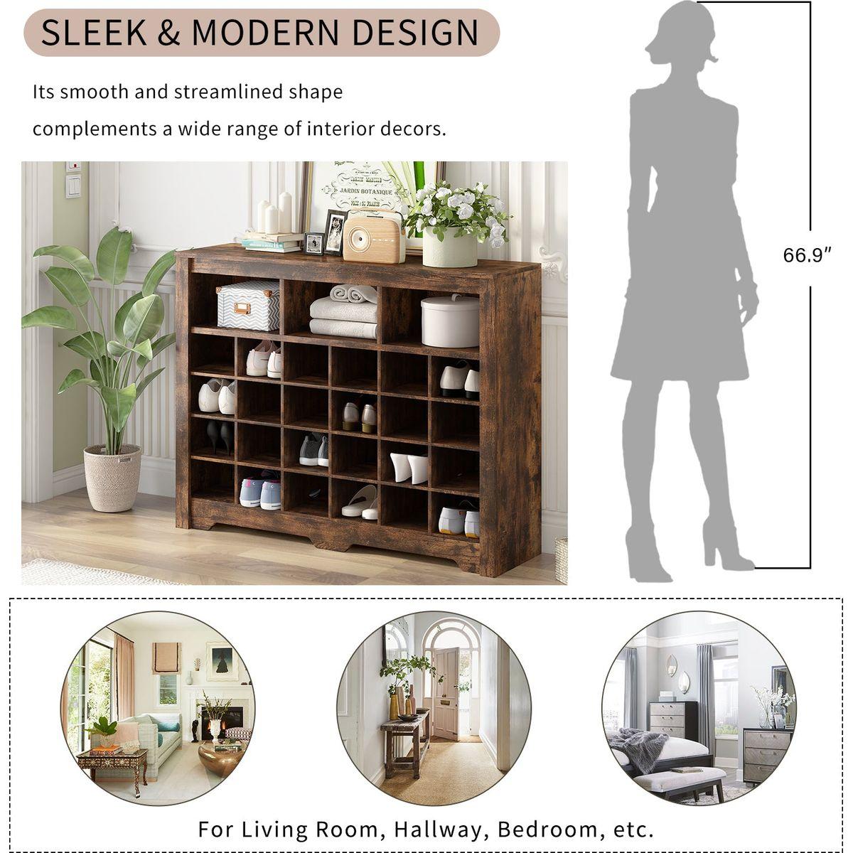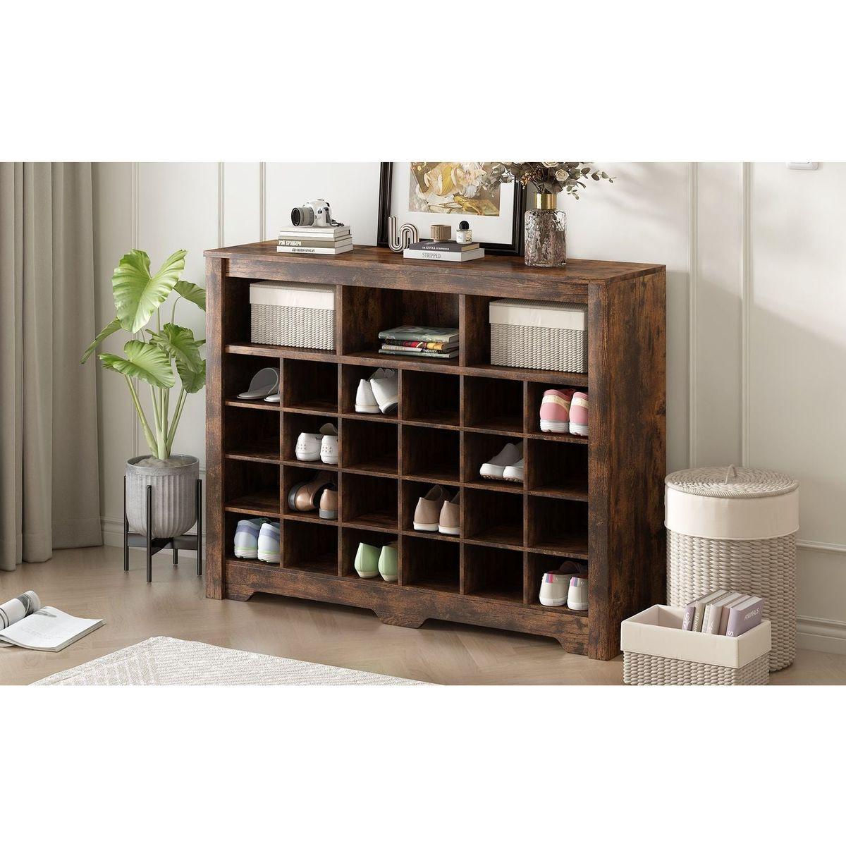 Sleek Design 24 Shoe Cubby Console, Modern Shoe Cabinet with Curved Base, Versatile Sideboard with High-quality for Hallway, Bedroom, Living Room, Rustic Brown