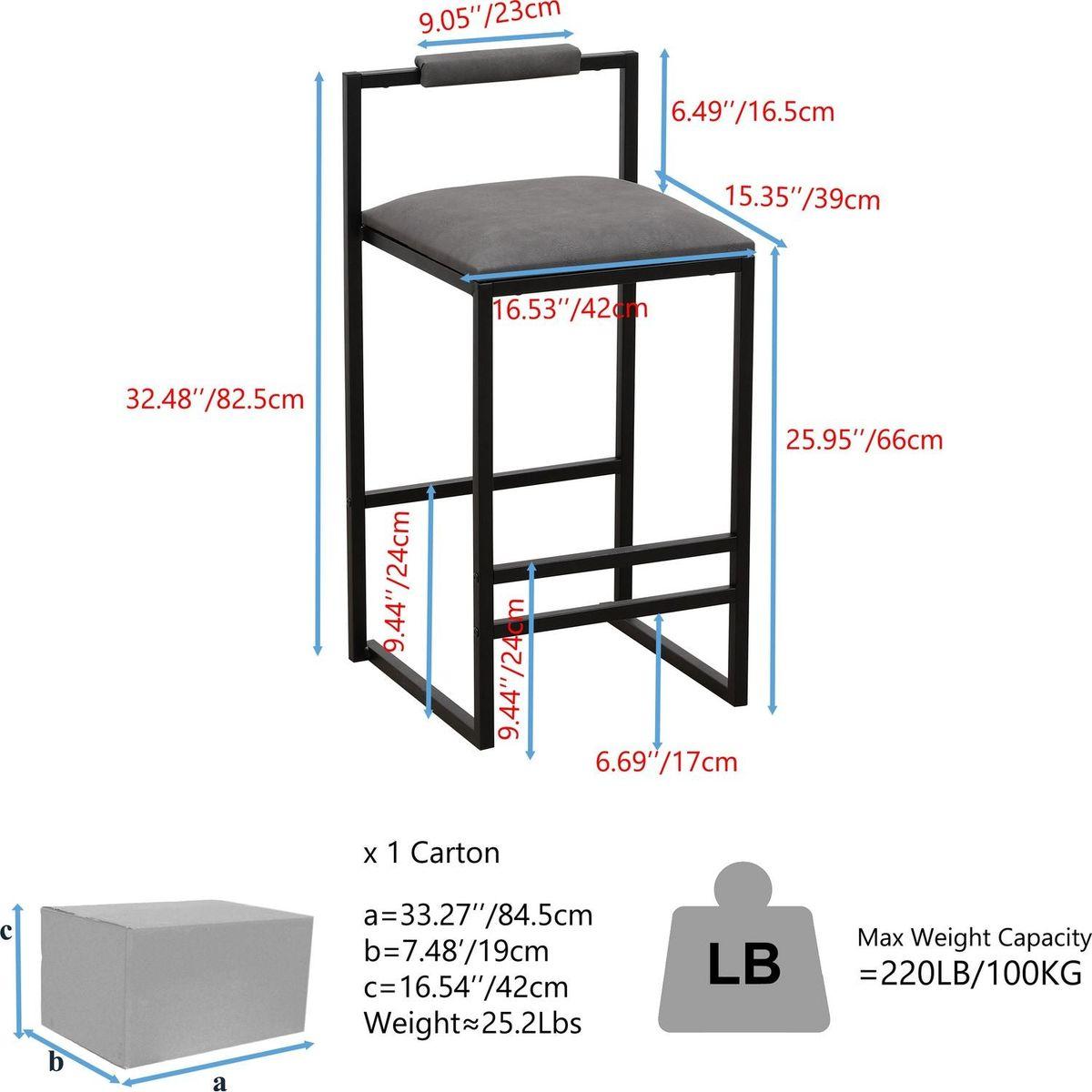 Experience Comfort: Sink into the soft and comfortable PU upholstered seat filled with foam for ultimate relaxation while enjoying your meals or drinks at the counter. The sturdy black metal frame and anti-slip screws ensure a durable and stable experience. Stunning Style: Complement any home decor with the minimalist and sleek solid gray PU design. The modern and fashionable look of these counter-height barstools will elevate your space to the next level. Perfect Size & Weight Capacity: These stools measure 16.54"(L) x 15.35"(W) x 32.48''(H) and can accommodate up to 220lbs. Perfect for most people and spaces. The set of 2 stools comes in one box, with a weight of about 25lbs and dimensions of 33.27''x7.48''x16.34''(LxWxH). Versatile Functionality: Ideal for use in bars, kitchens, dining rooms, living rooms, vanity rooms, cafes, apartments, homes, and offices, these stools offer versatility in function and style. Easy Assembly: The package comes with tools and instructions for easy assembly. One person can effortlessly install these bar stools by following the instructions provided. Enjoy stylish and comfortable seating in no time!