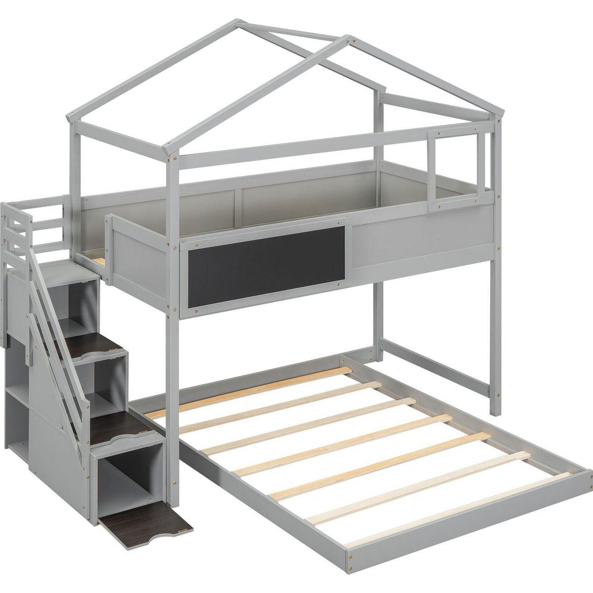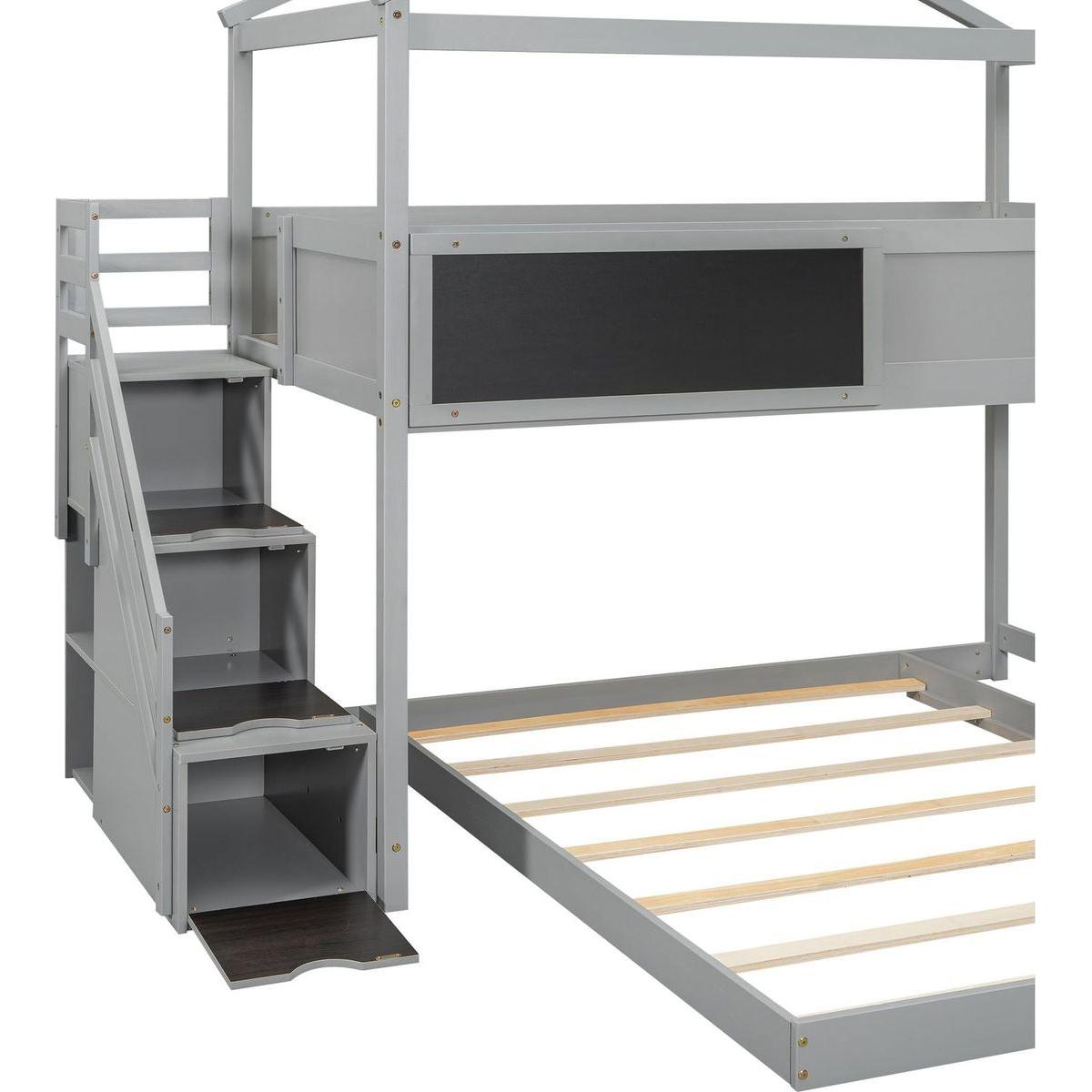 Twin over Full House Bunk Bed with Storage Staircase and Blackboard,Gray