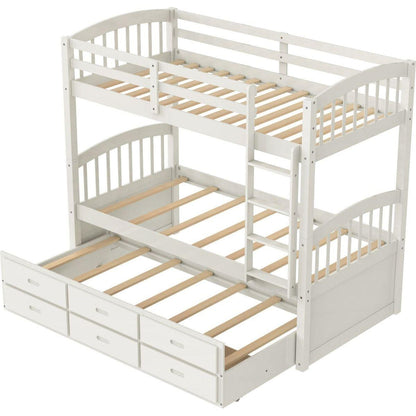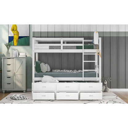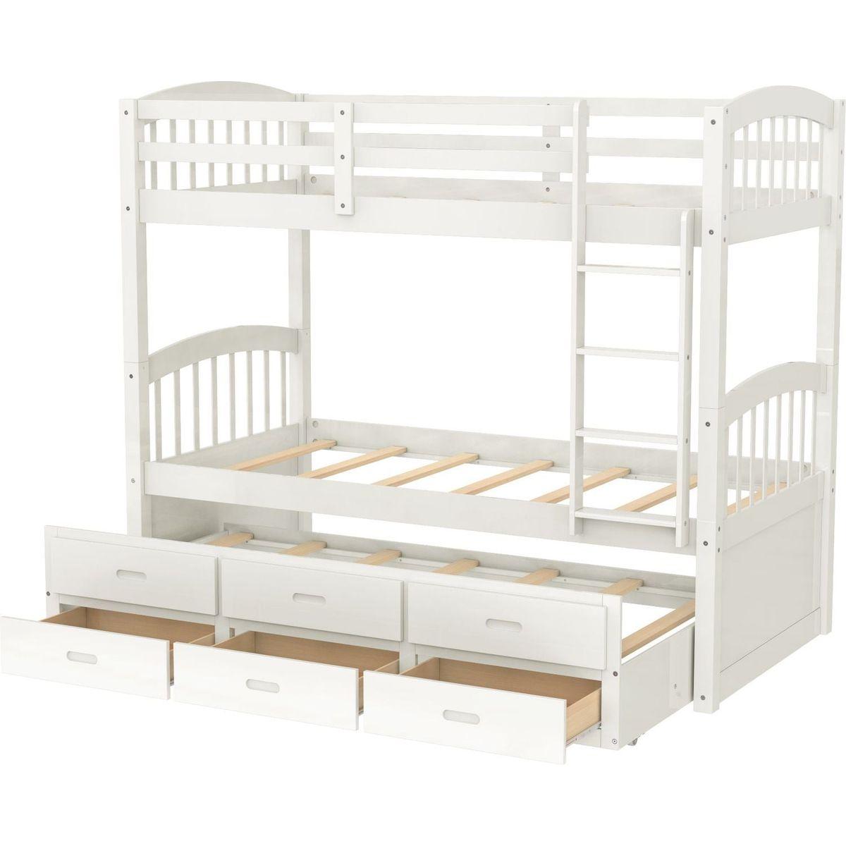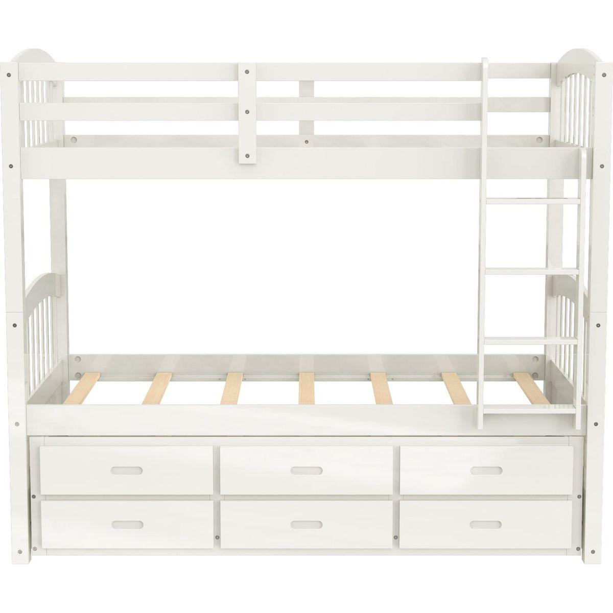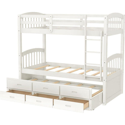 Twin over Twin Wood Bunk Bed with Trundle and Drawers, White