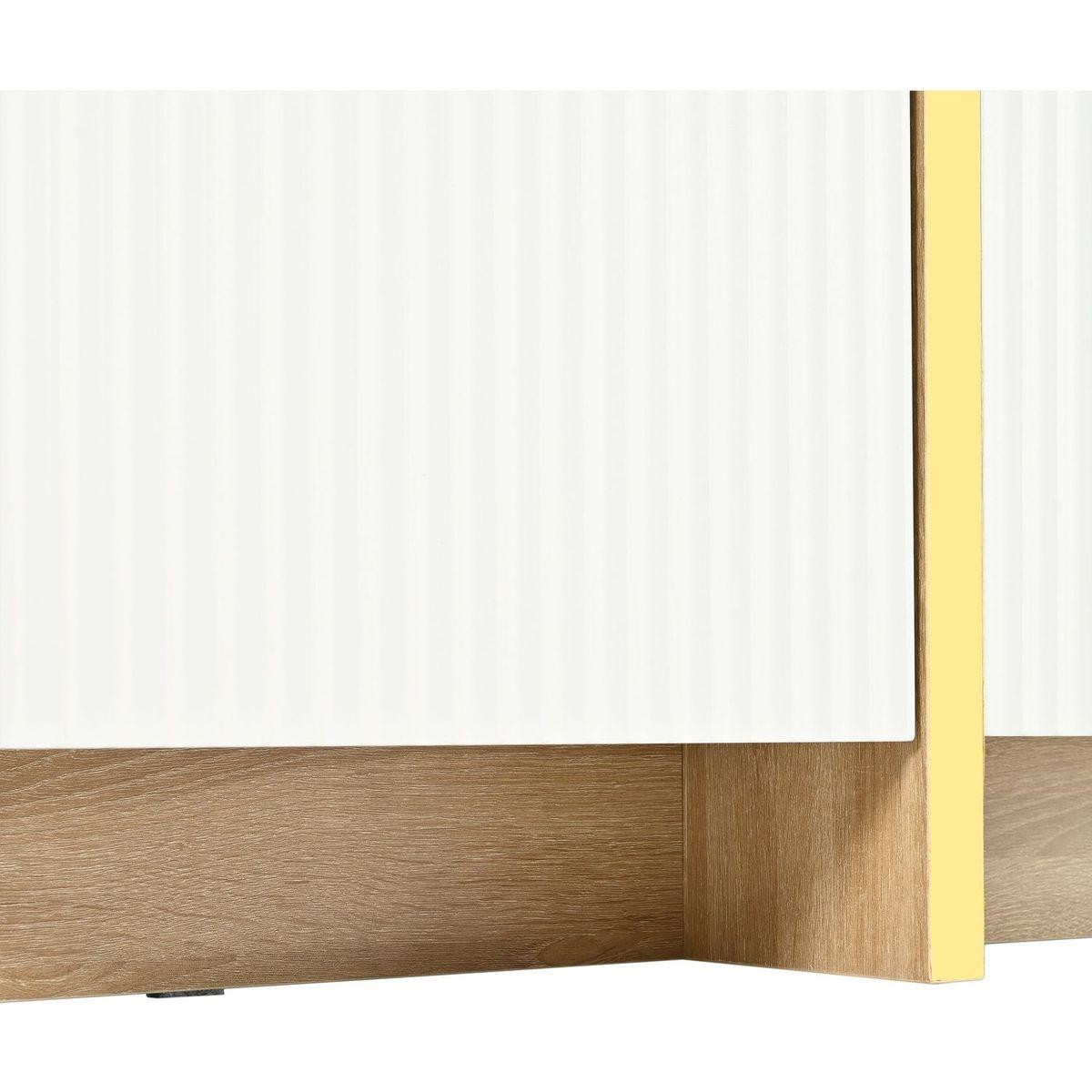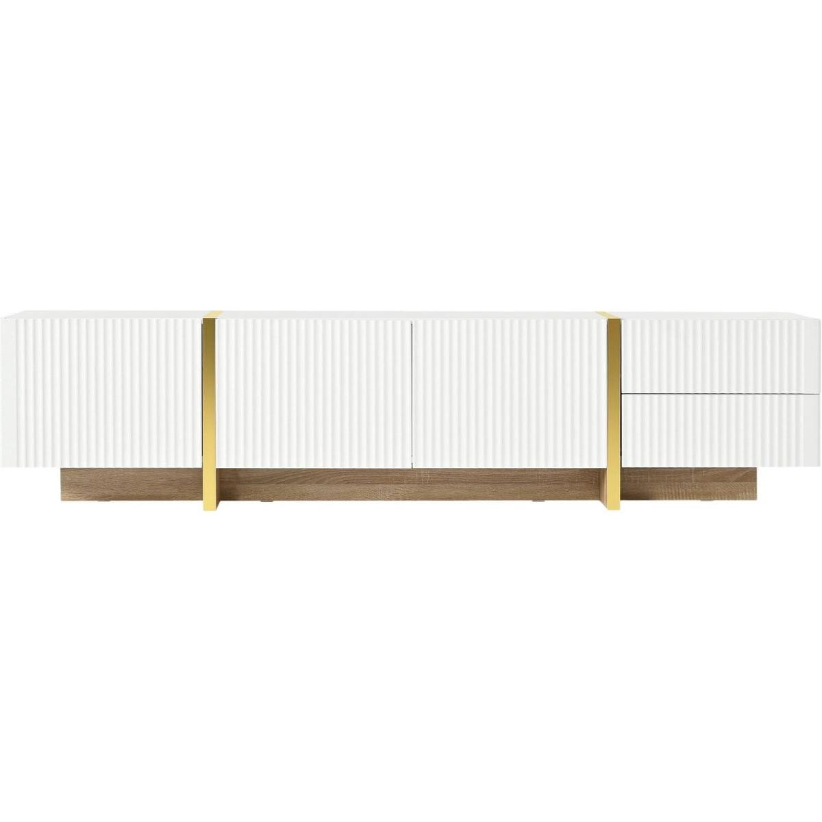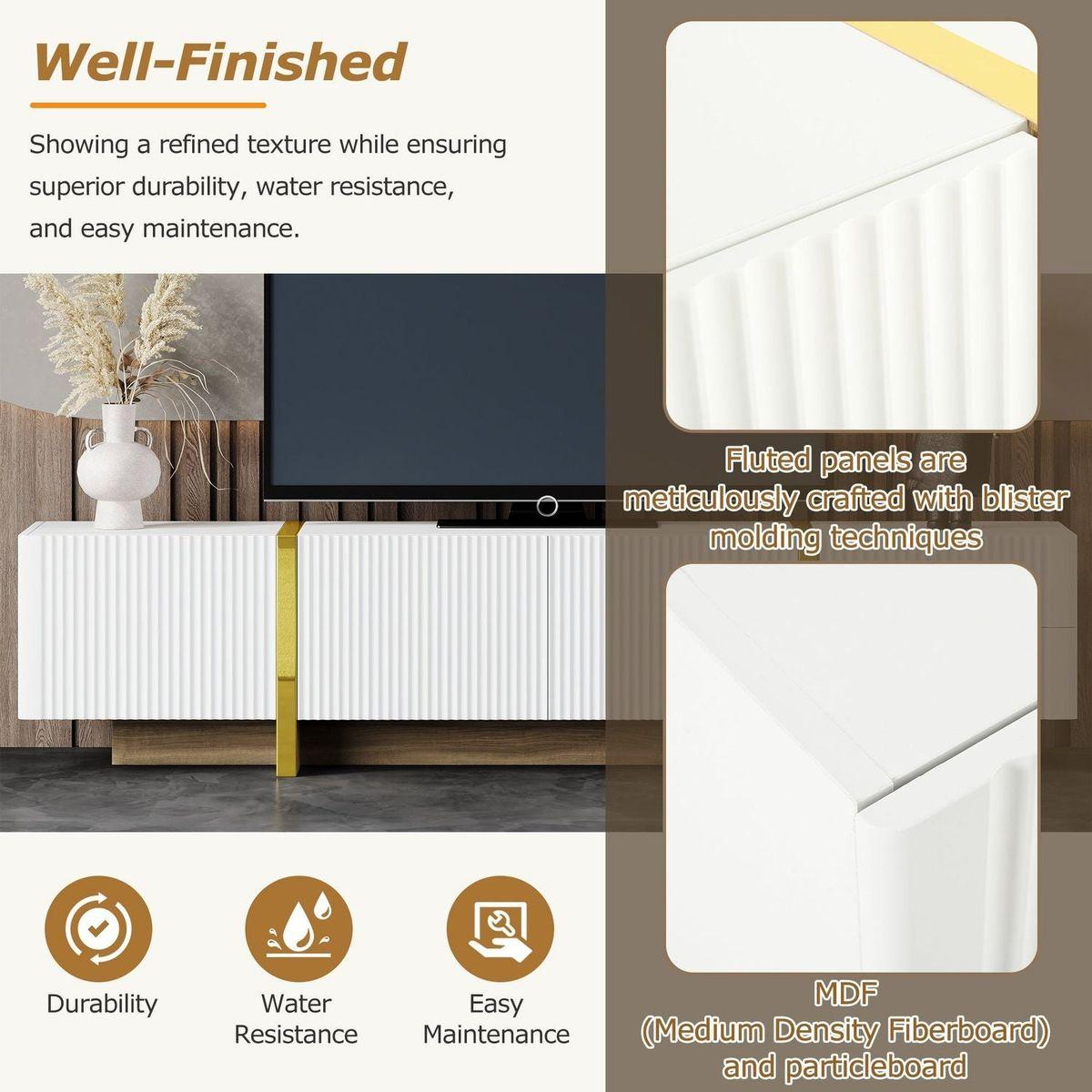 - Featuring smooth fluted panels and golden wood grain legs, this TV stand emanates a luxurious elegance that harmoniously complements a wide range of modern furniture styles.
