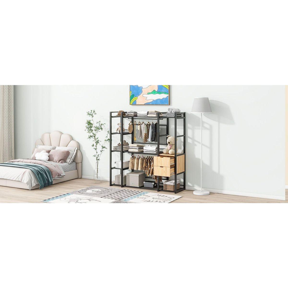 - [Maximized space] The wardrobe maximize your closet space with this open-style clothing rack. The hanging rails and metal shelves provide ample room for clothes and accessories.