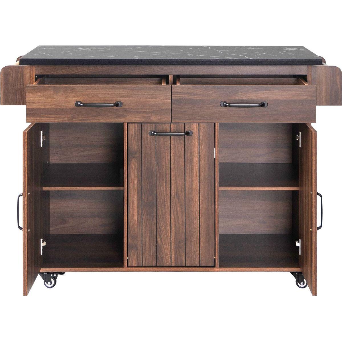 | Summary | This kitchen island brings significant savings to your cooking space and indoor storage. Constructed from P2 Grade Particleboard, stripes on the cabinet doors give it an attractive look. The multipurpose tilt-out trash can it carries is a great feature of the product, with two drawers, two cabinets, and a spice rack and towel rack, your kitchen essentials will no longer be cluttered. The rolling kitchen cart sits on lockable casters for easy mobility and stability. The thoughtfully designed drop leaf can be opened and folded. In addition, there are adjustable shelves for your flexible storage needs. |