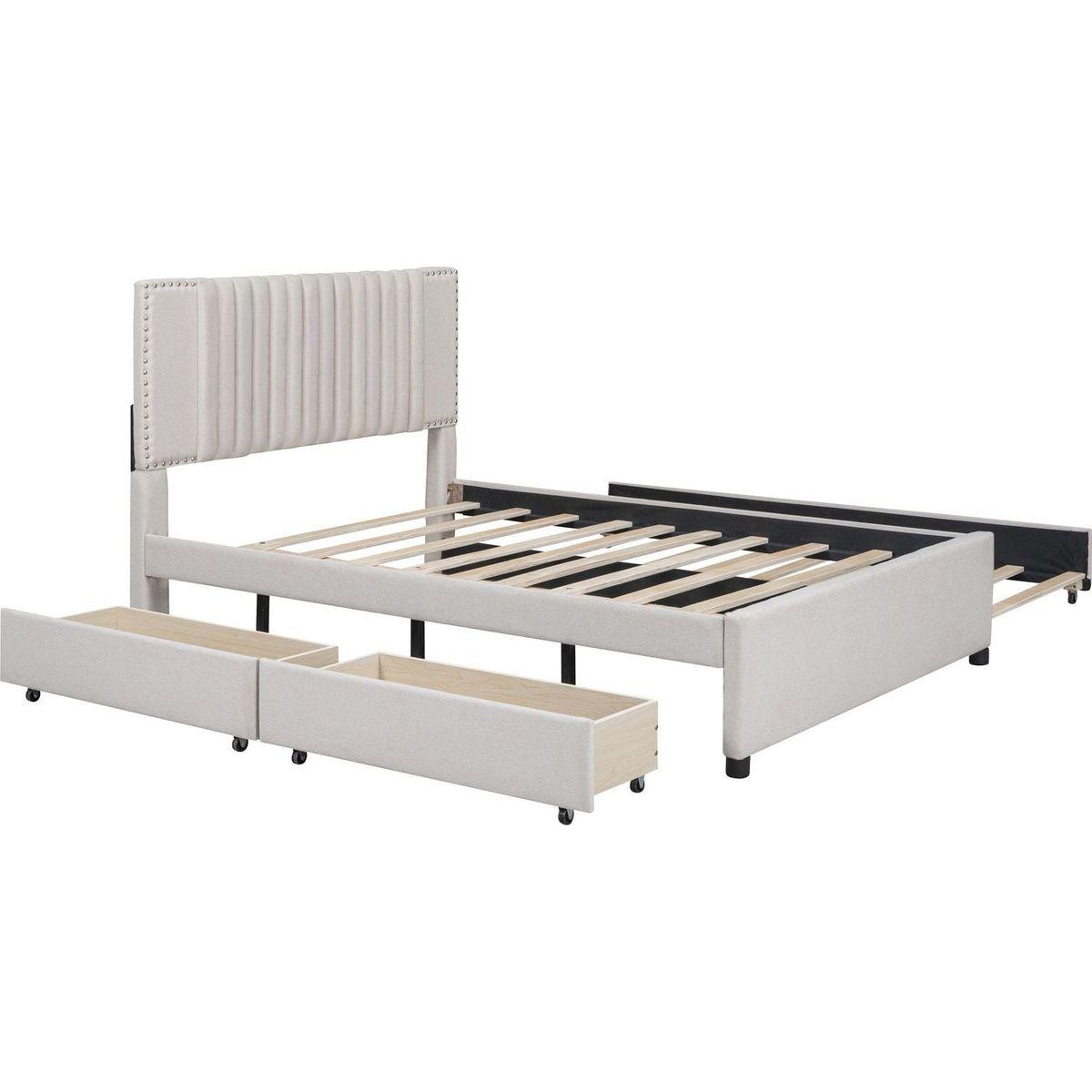 Full Size Upholstered Platform Bed with 2 Drawers and 1 Twin Size Trundle, Classic Headboard Design, Beige