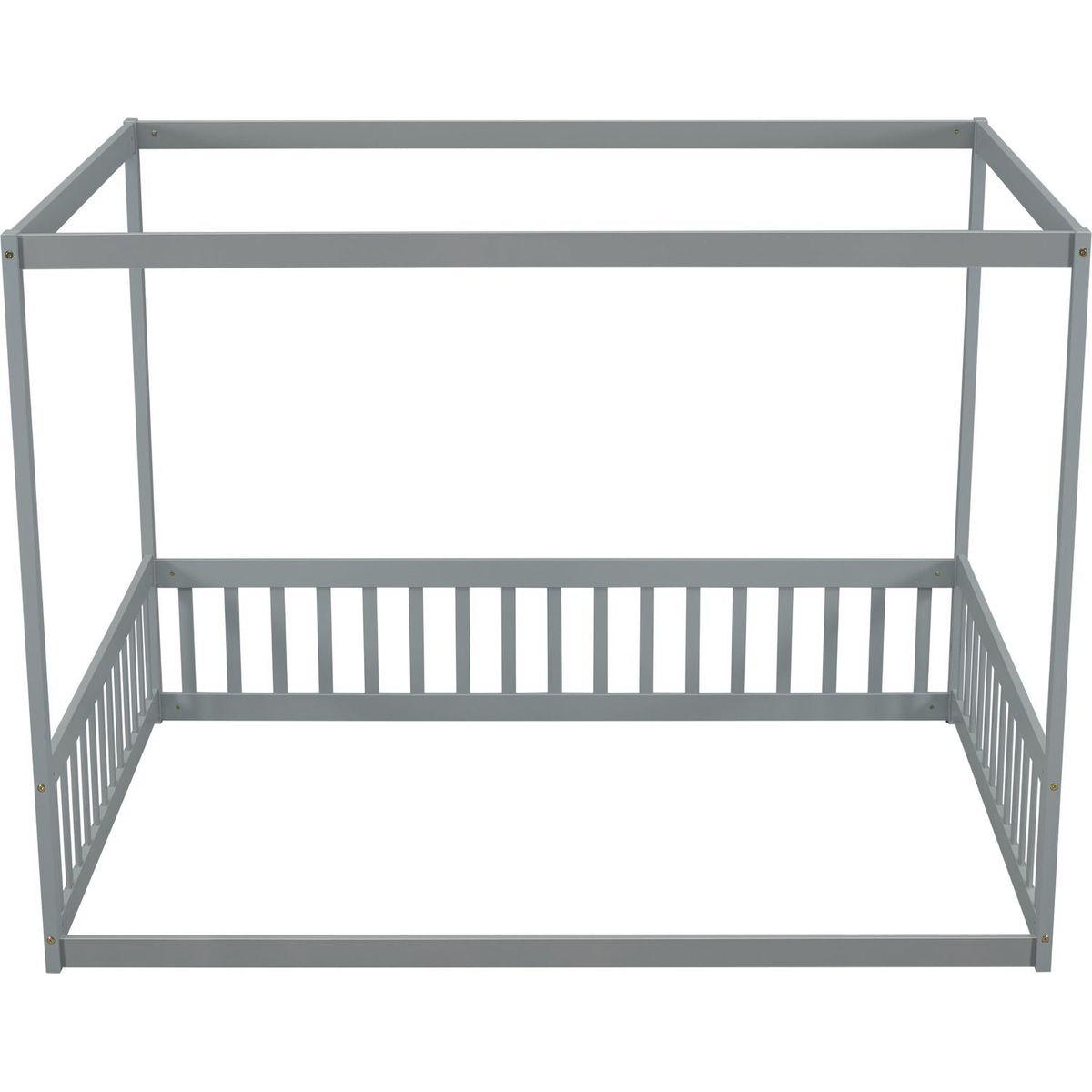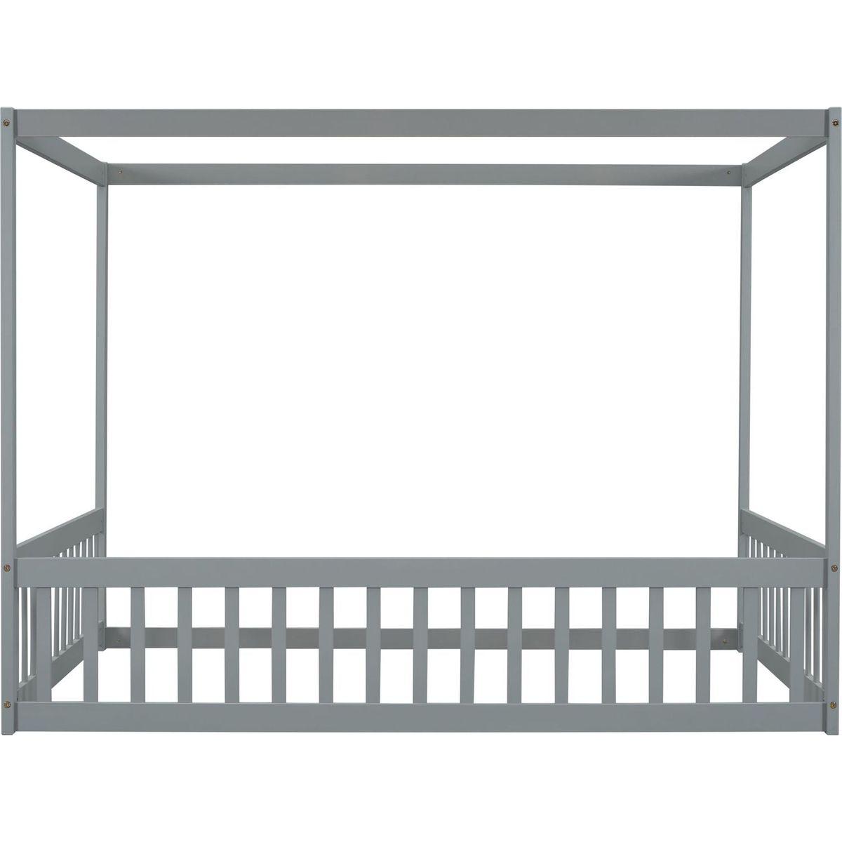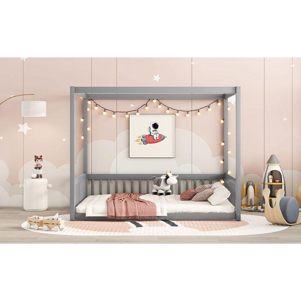 Full Size Canopy Frame Floor Bed with Fence, Guardrails,Grey