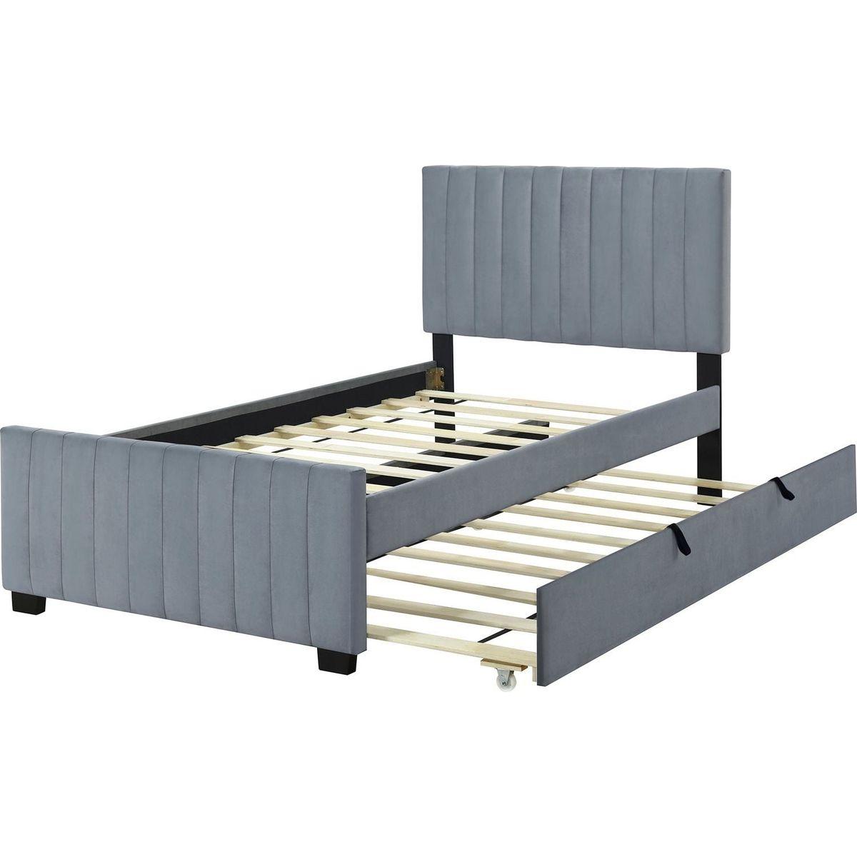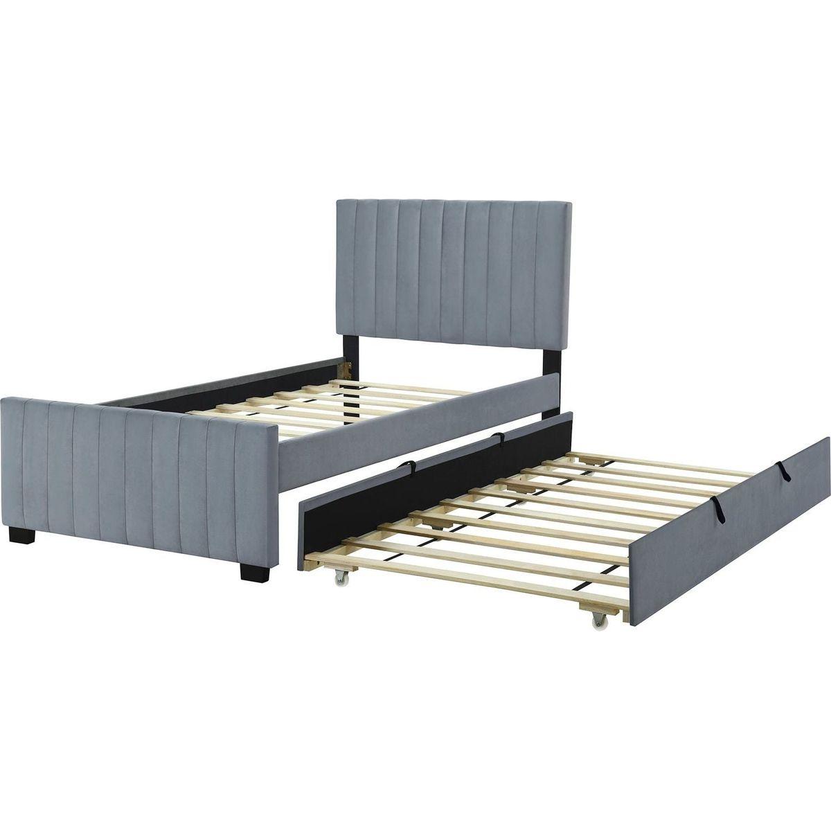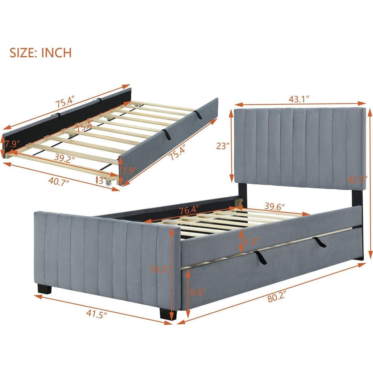 Twin Size Velvet Upholstered Platform Bed with Twin Size Trundle, Gray