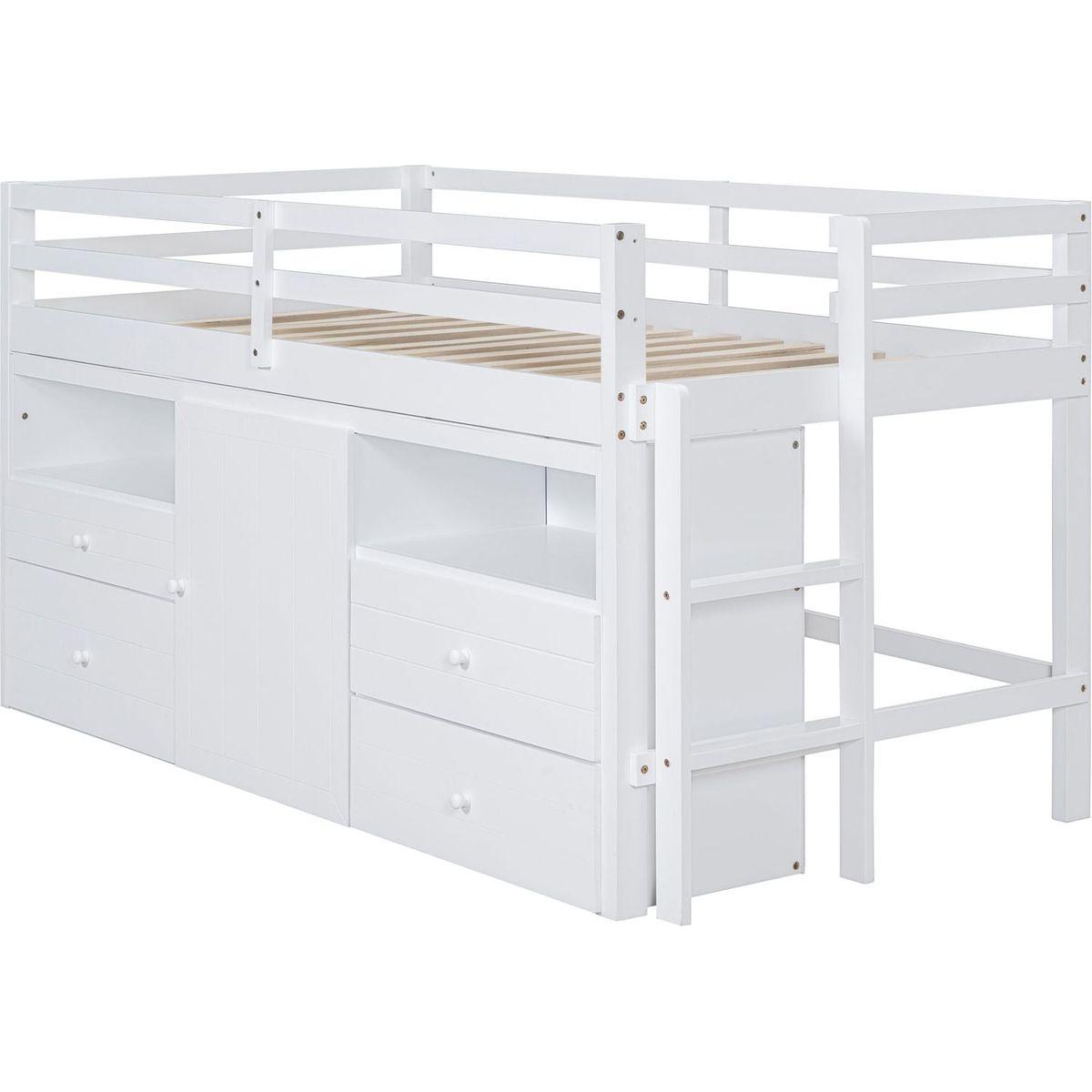 Twin Size Loft Bed with 4 Drawers, Underneath Cabinet and Shelves, White