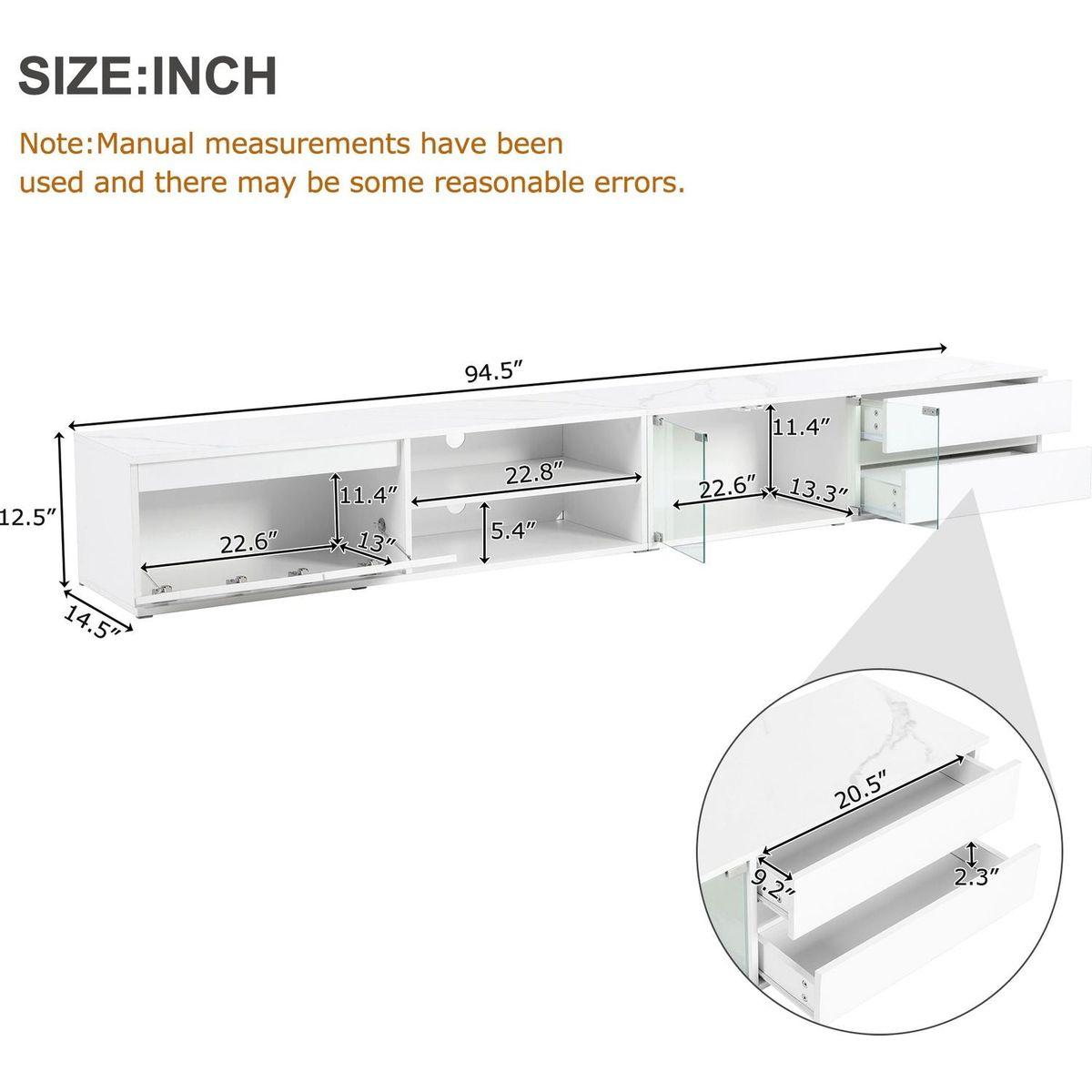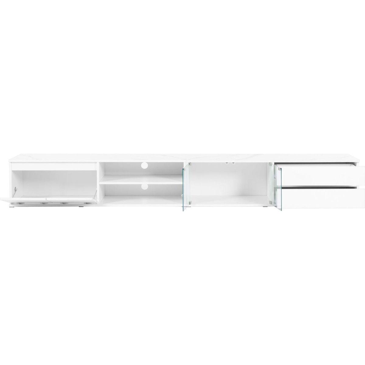 Modern APP Controlled LED TV Stand for TVs Up to 105", Faux Marble Tabletop Media Console with Tempered Glass Doors, Entertainment Center with 2 Drawers & Cabinets for Living Room, White