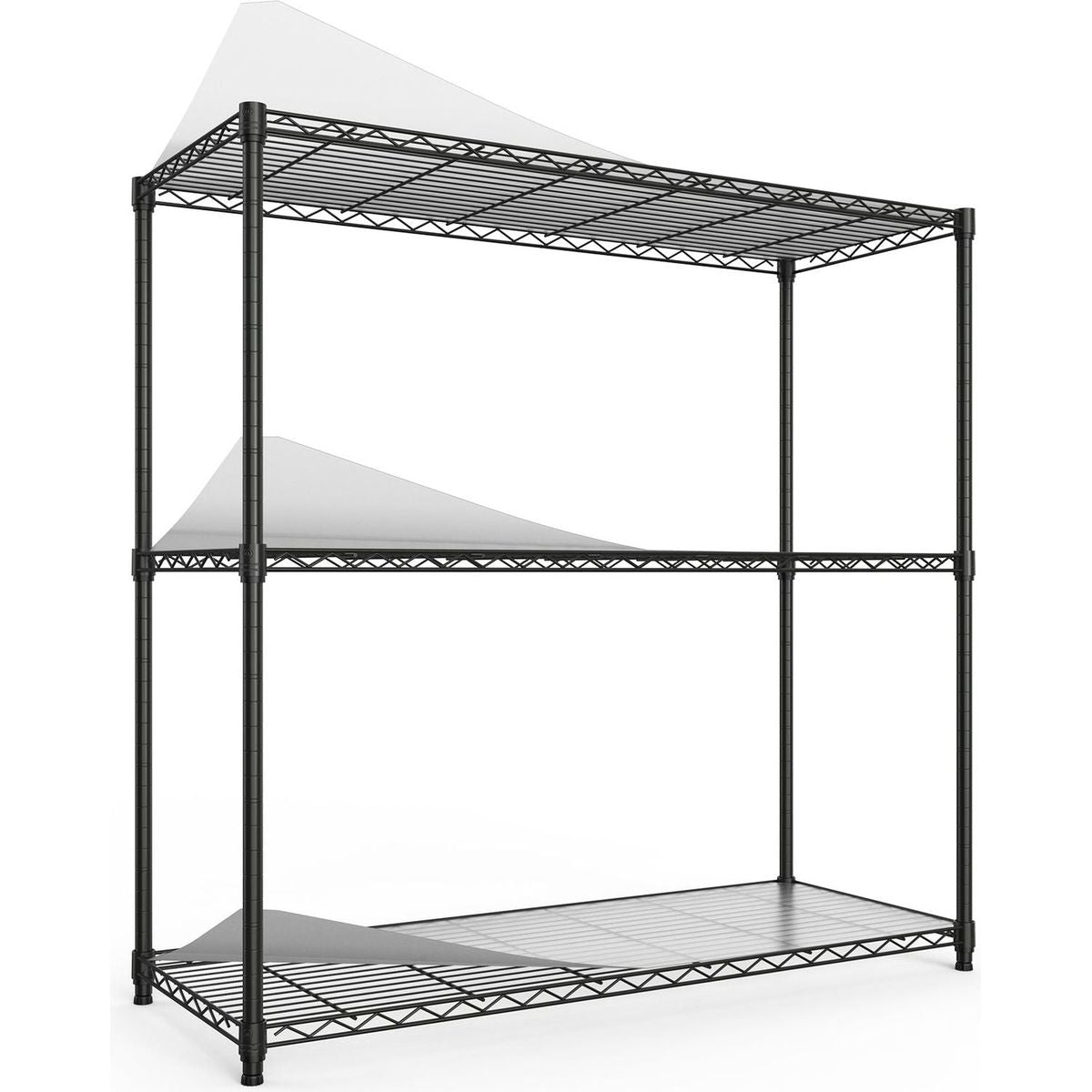- [EASY MOVEMENT] - 3 tier garage shelves have 4 leveling feet. Wire rack on leveling feet can be easily positioned in supermarkets, garages, closets, kitchens, porch, pantry, etc. Height-adjustable leveling feet can be placed on uneven ground- simply twist to stabilize. Non-slip, will not scratch ground.