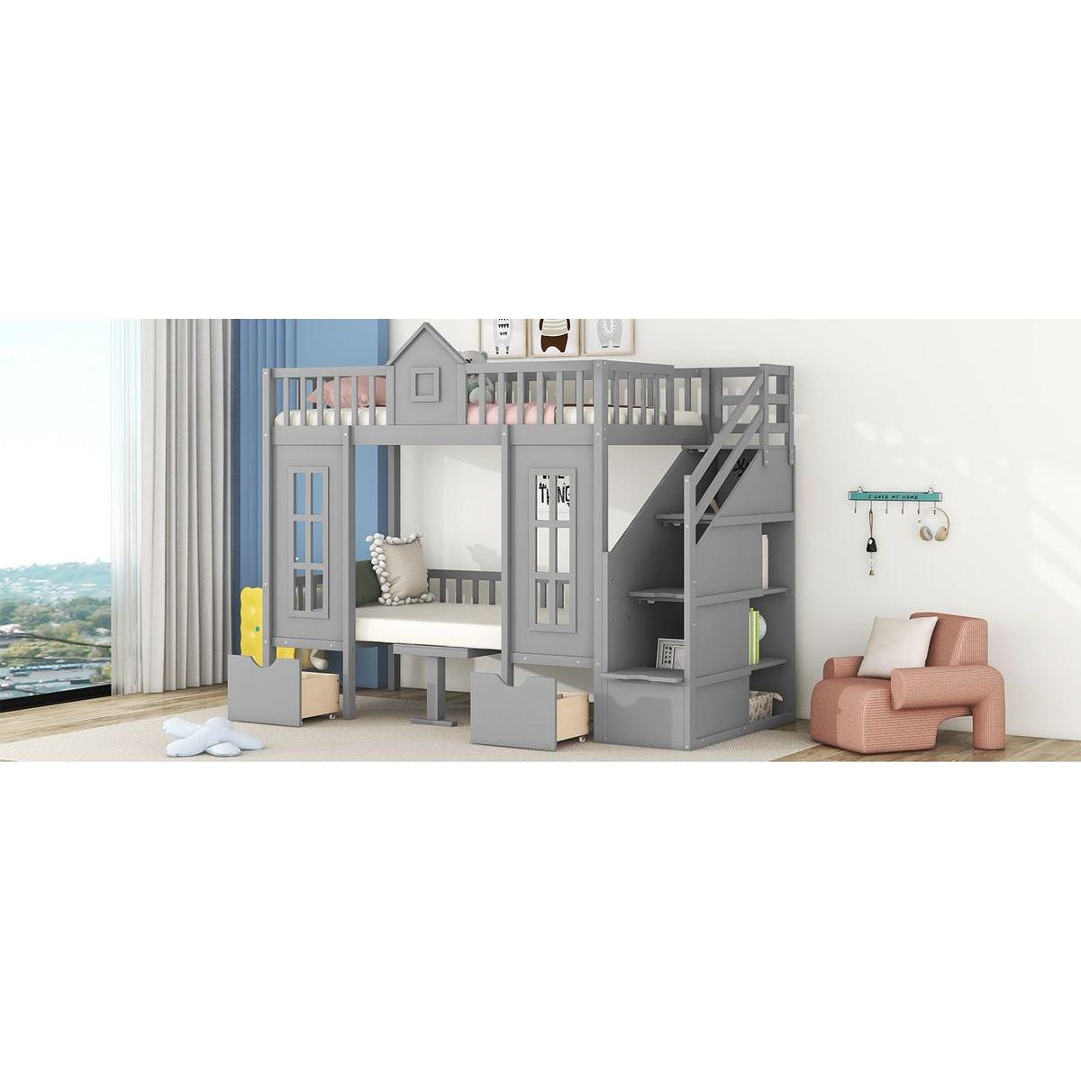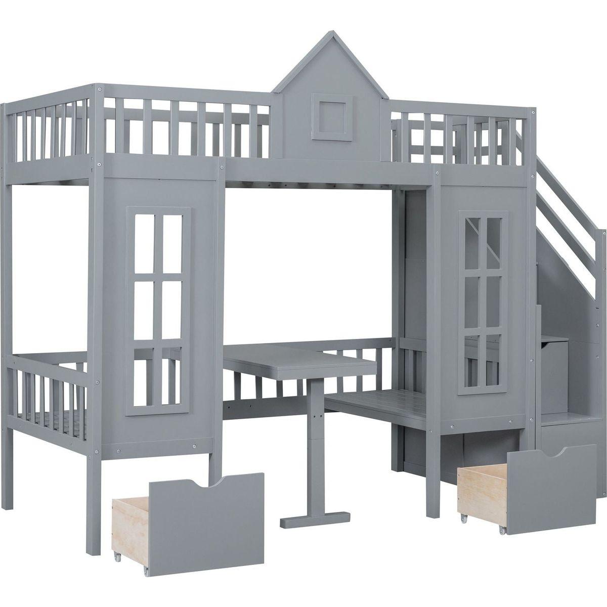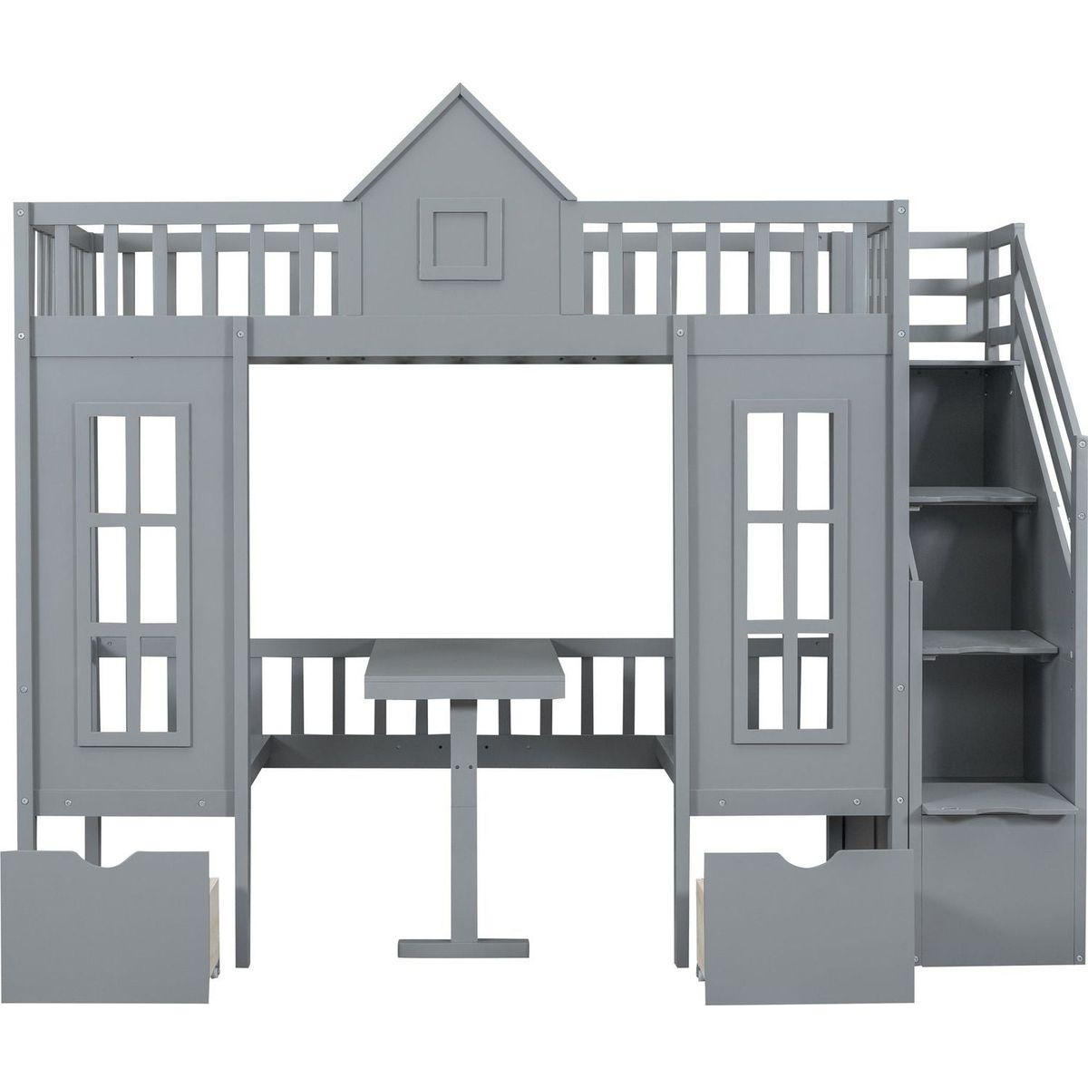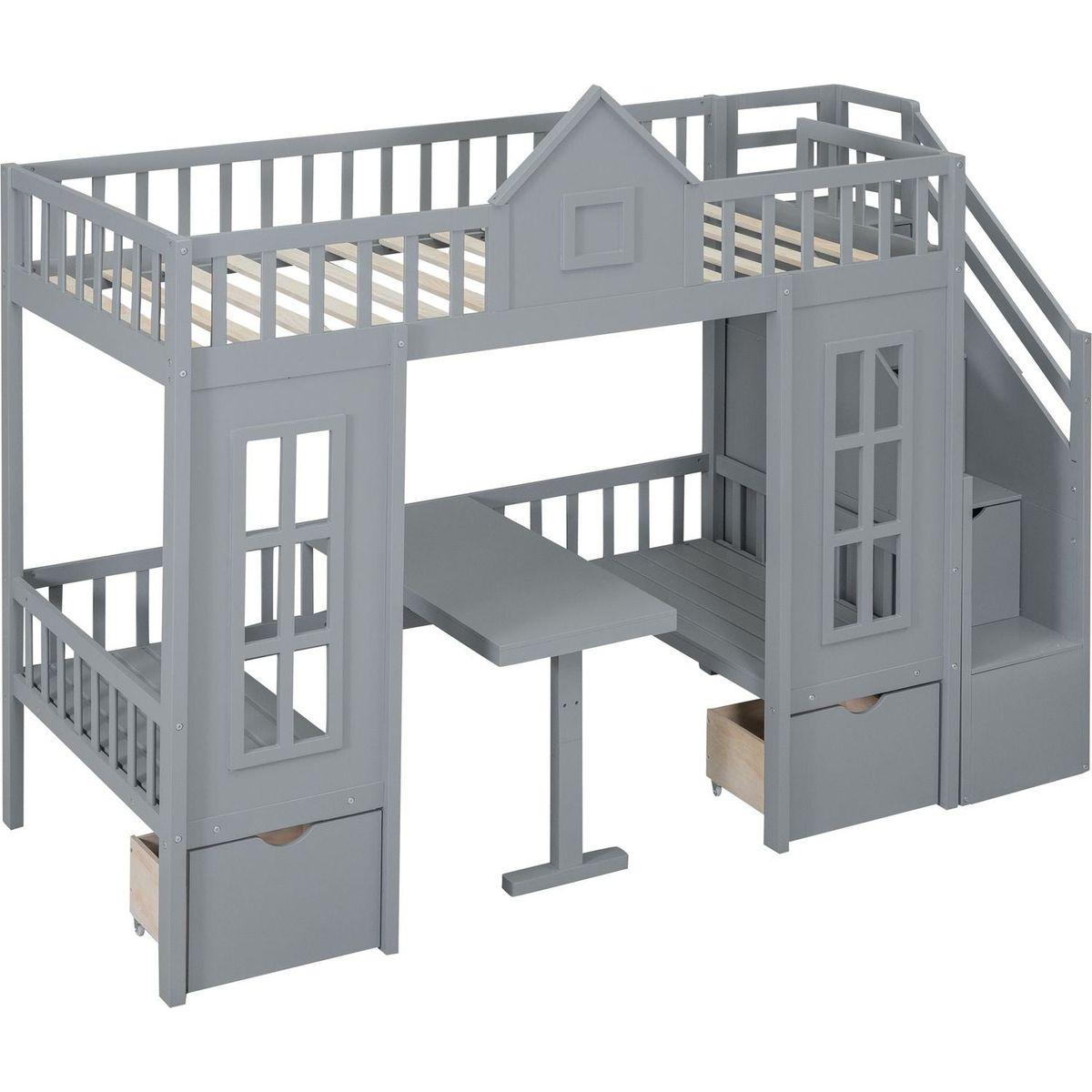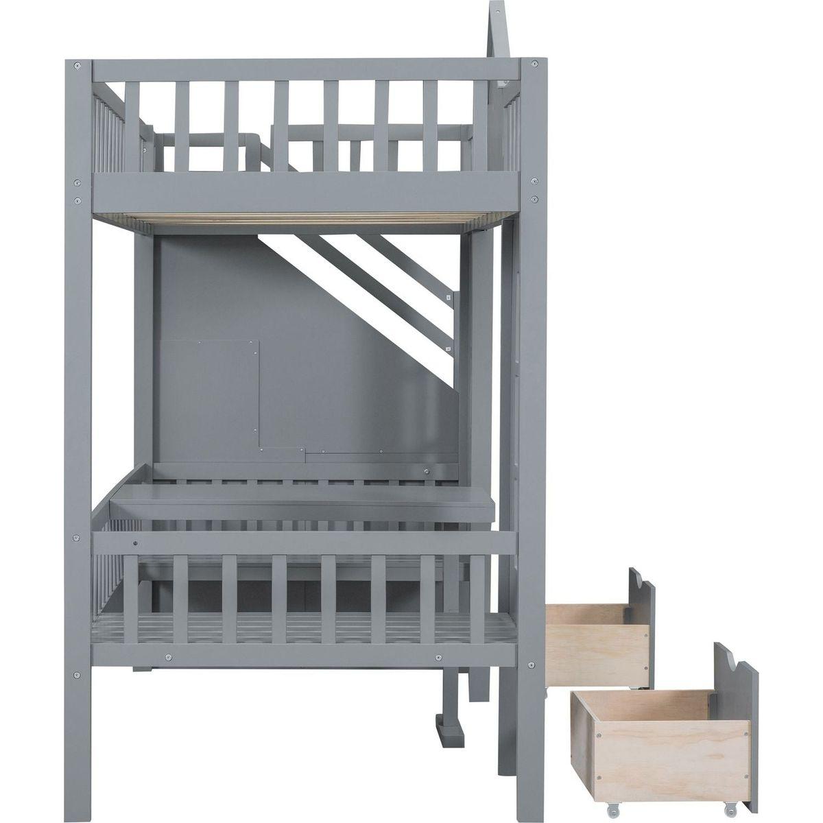 Twin-Over-Twin Bunk Bed with Changeable Table, Bunk Bed Turn into Upper Bed and Down Desk -Gray