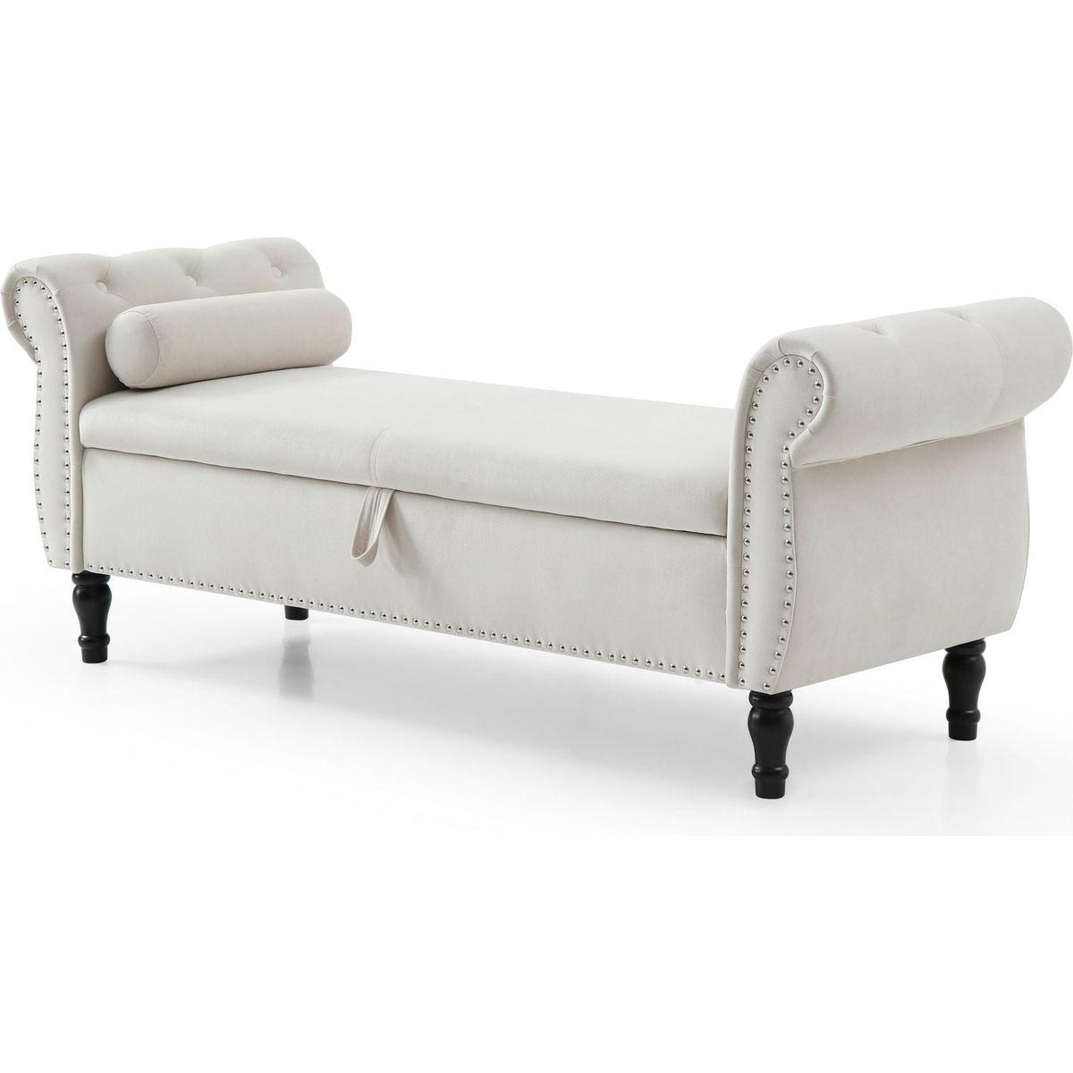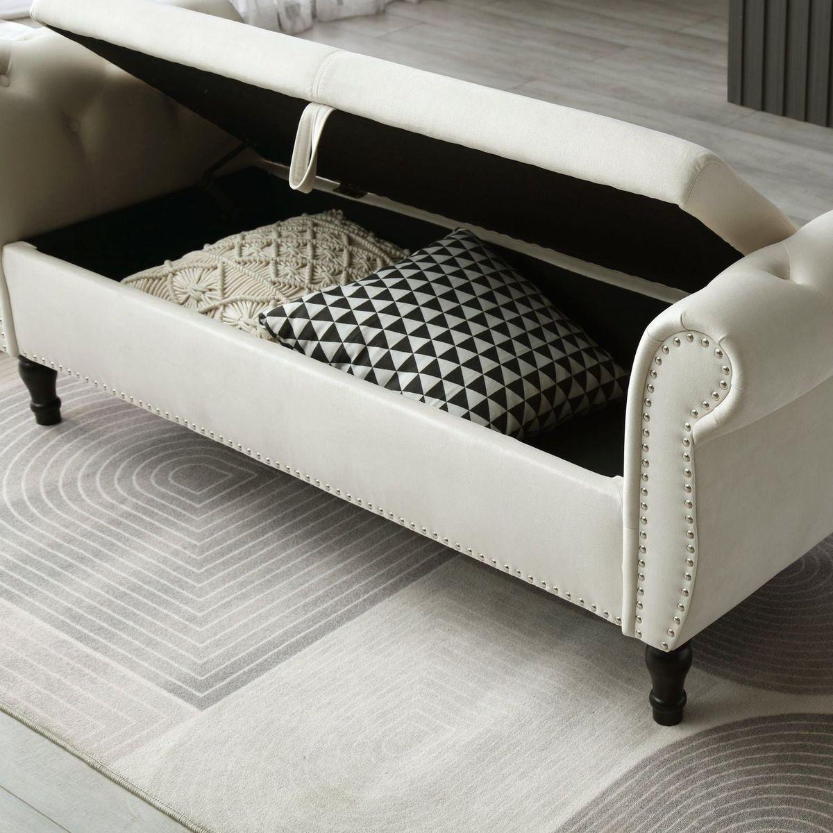 63" Velvet Multifunctional Storage Rectangular Sofa Stool Buttons Tufted Nailhead Trimmed Solid Wood Legs with 1 Pillow, Beige