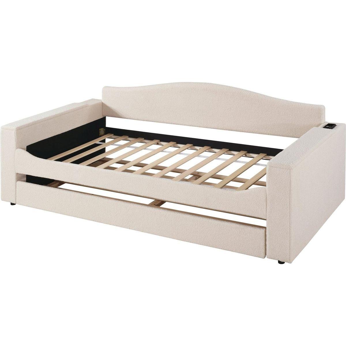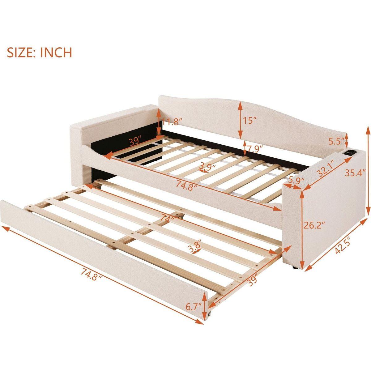 Twin Size Upholstered Daybed with Storage Armrests, Trundle and Latest Integrated Bluetooth Audio System, Teddy Fleece, Beige