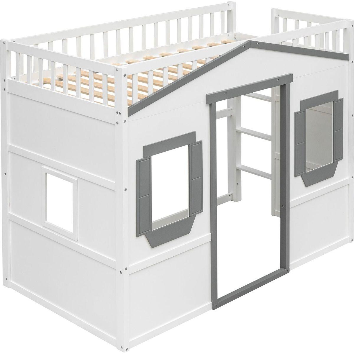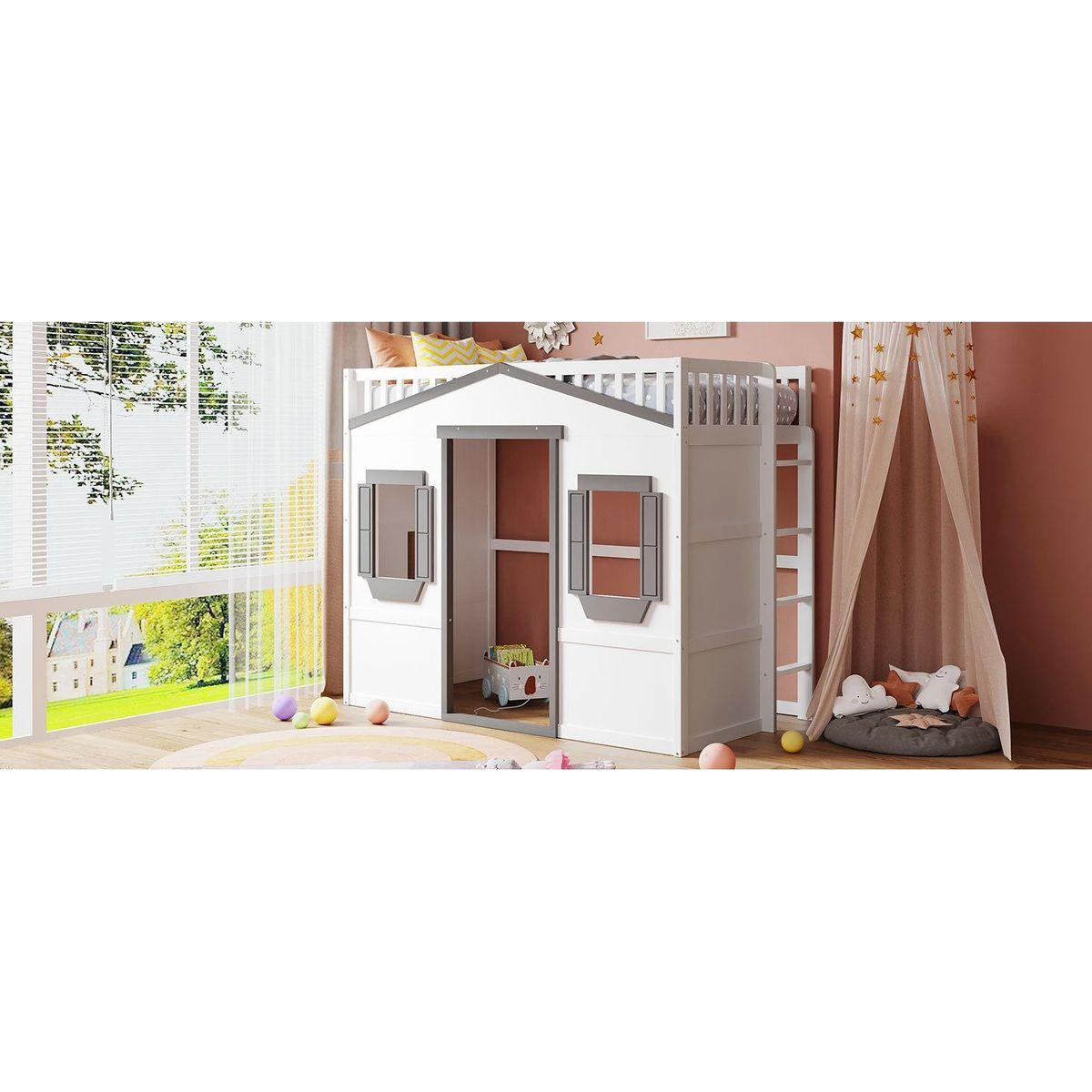 Twin Size House Loft Bed With Ladder-White+Gray Frame