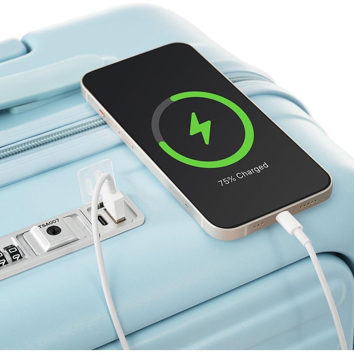 Luggage Set of 3, 20, 24, 28inch with USB Port, 20, 24inch with front opening design Airline Certified Carry on Luggage with Cup Holder, ABS Hard Shell Luggage with Spinner Wheels, light blue