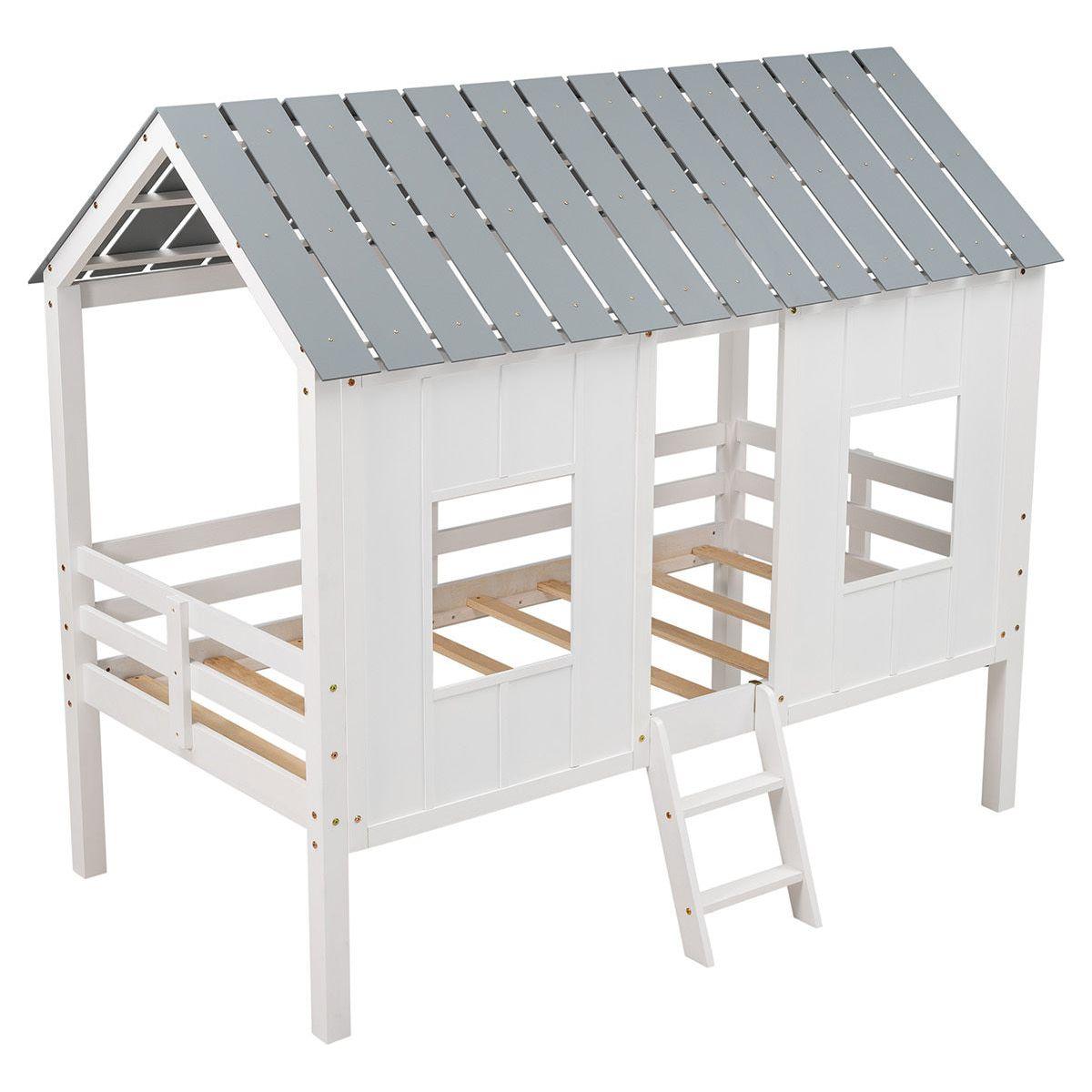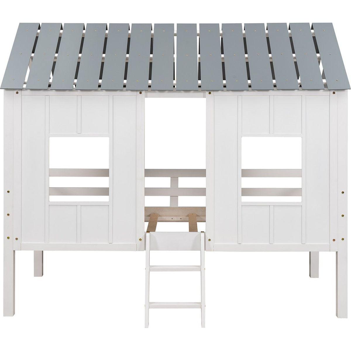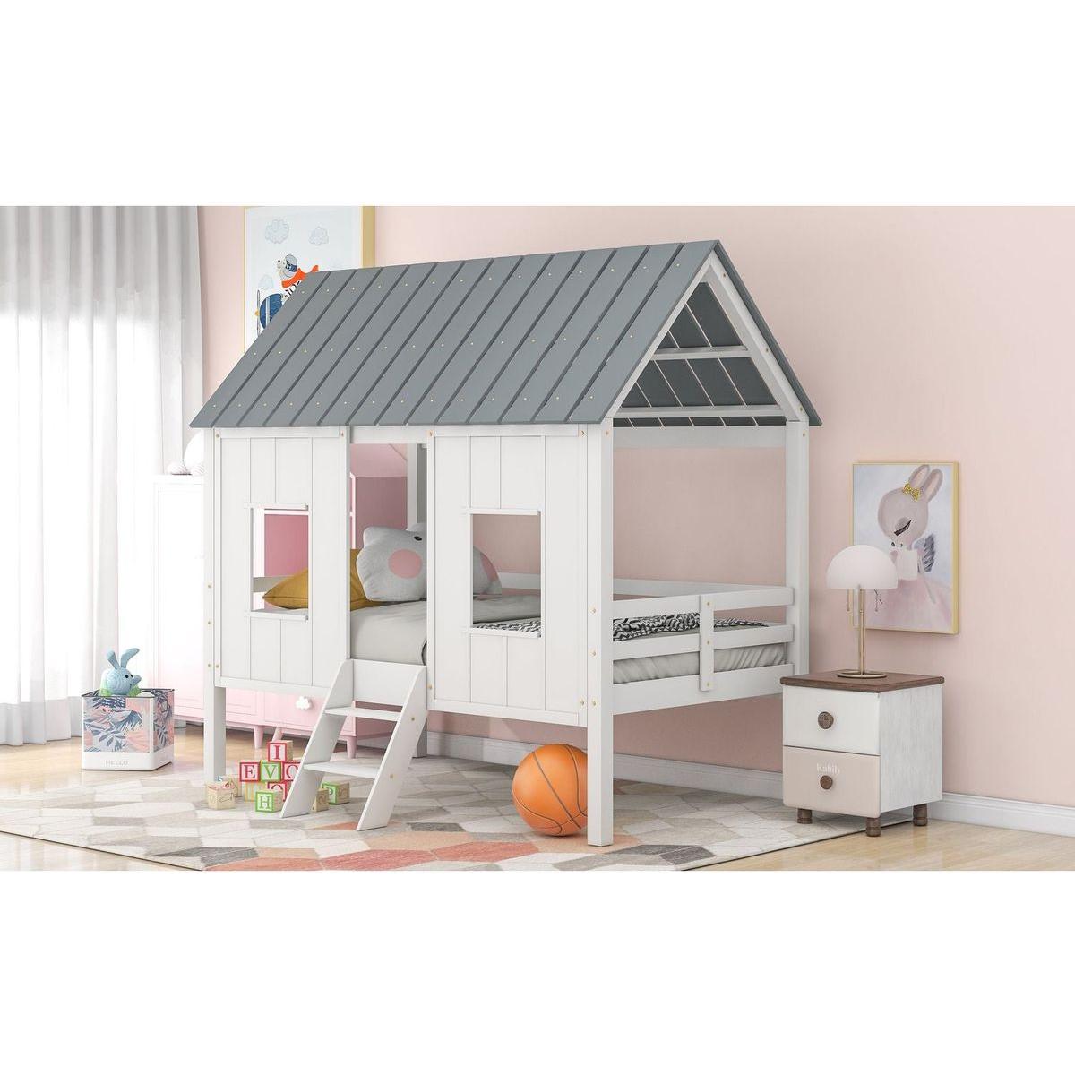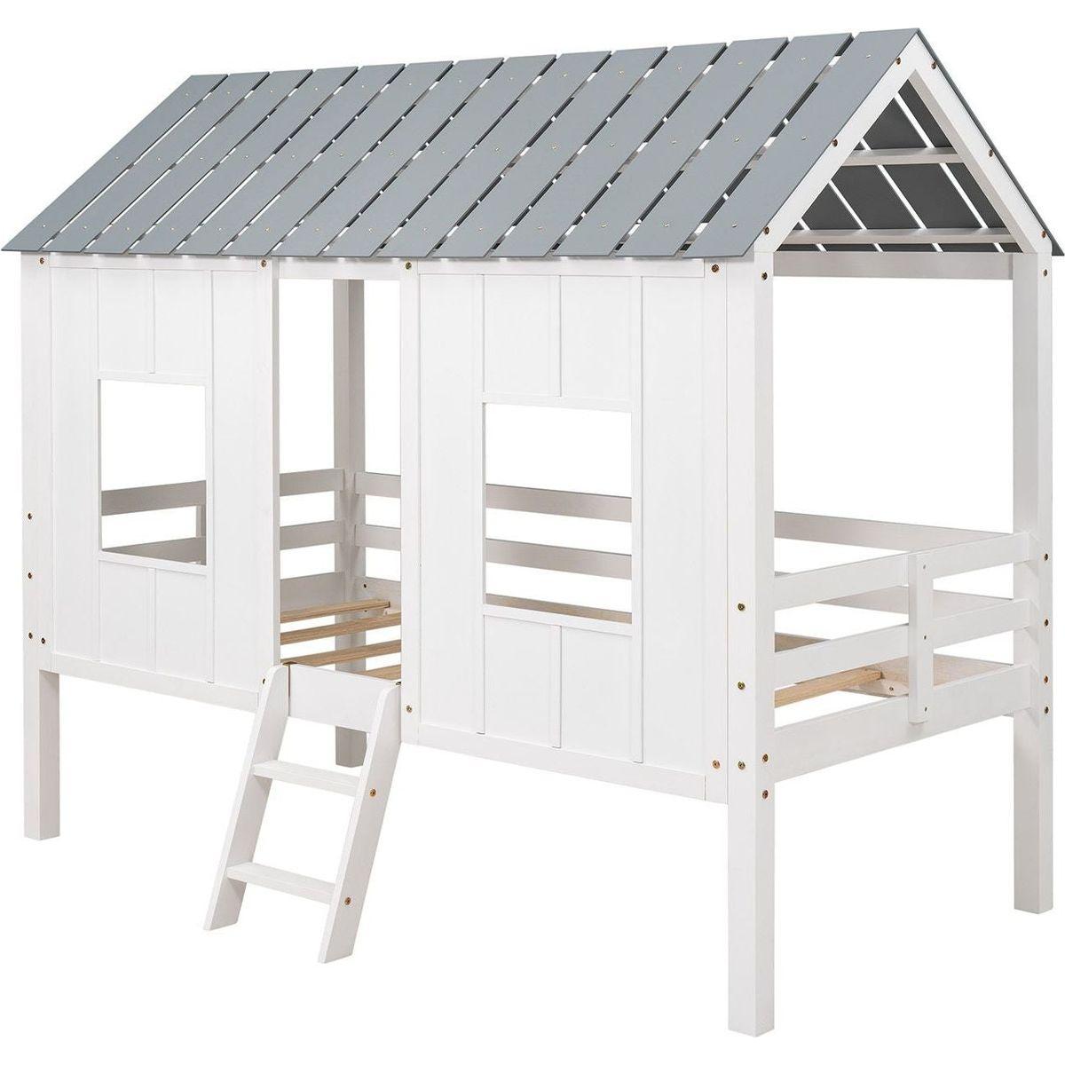 Twin Size Low Loft House Bed with Roof and Two Front Windows, White