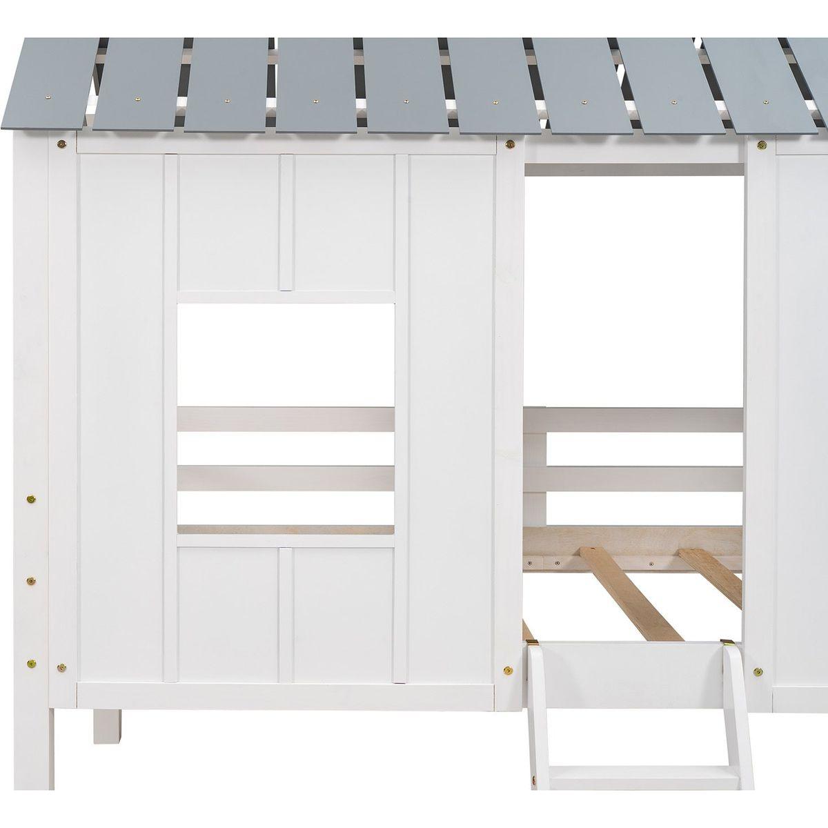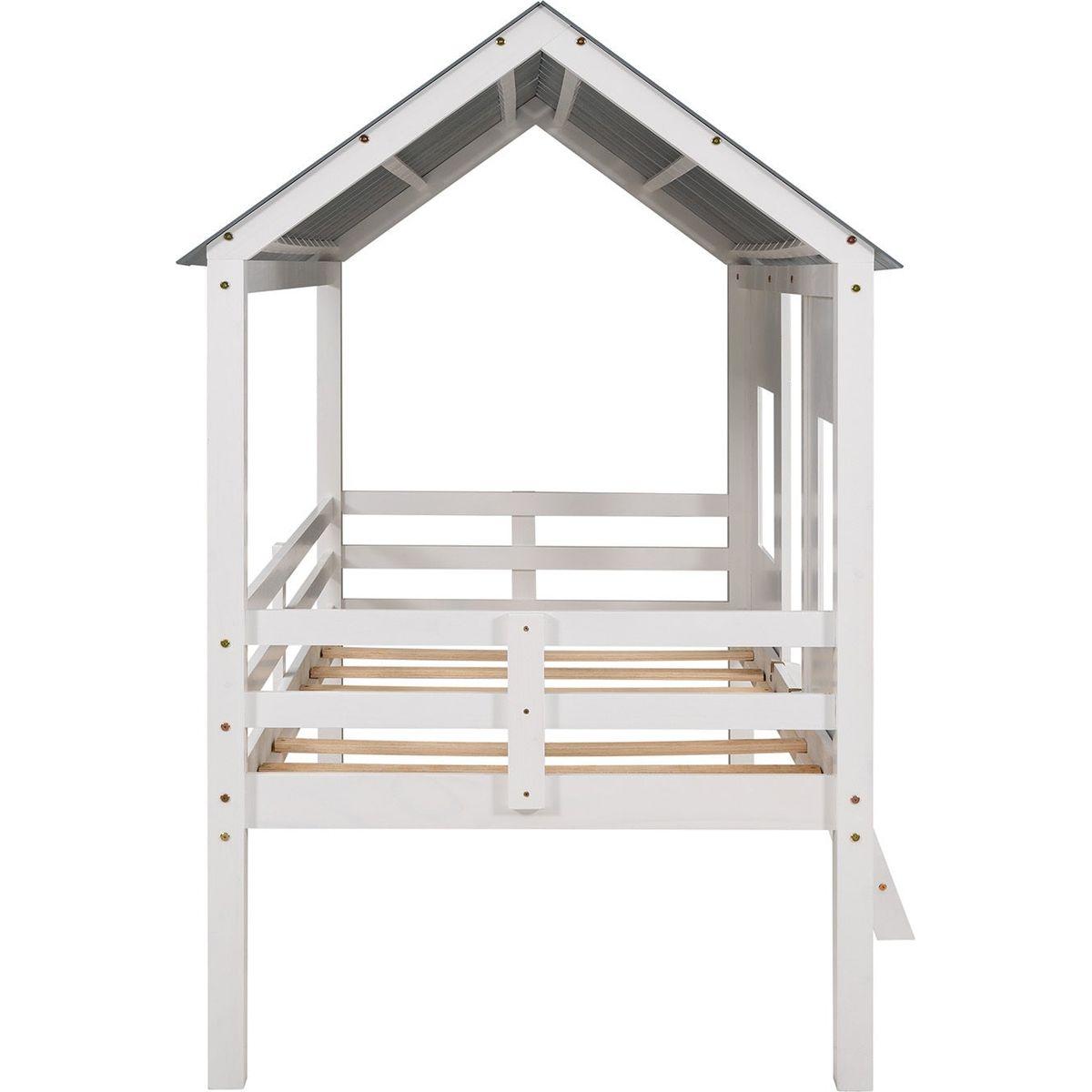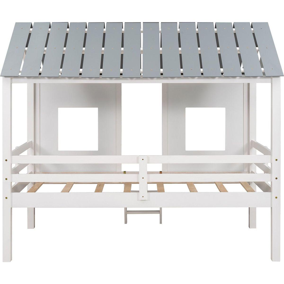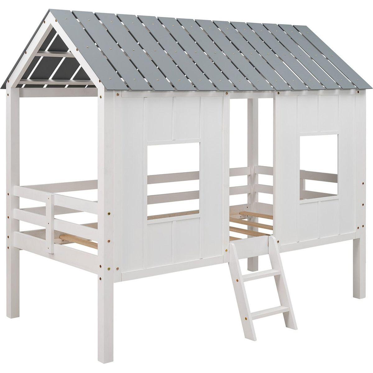 Twin Size Low Loft House Bed with Roof and Two Front Windows, White