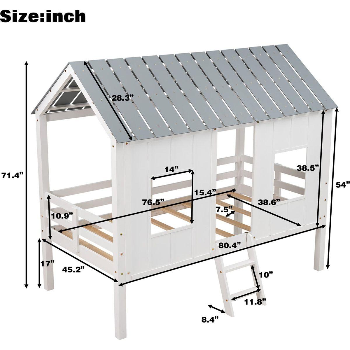 ⑤[Easy Assembly] Low Loft House bed for kids, no box spring required,Wood bunk bed frame is a value conscious choice as it does not require a box spring or foundation. Just place your mattress on (mattress not included) and enjoy precious playground time.