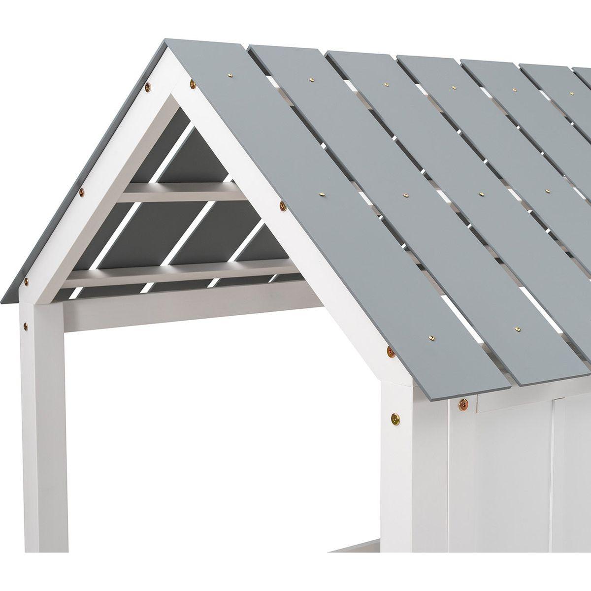 Featuring roof and two front windows, this bed doubles as a semi-enclosed play place perfect for kids to explore their imaginations. With guardrail and a sturdy pine frame, this bed offers a safe space for your kids to get a good night’s sleep.Featuring roof and two front windows, this unique bed creates a fun and adorable space that not only serves as a comfortable sleeping area but also double as a space for your kids to play and have fun.