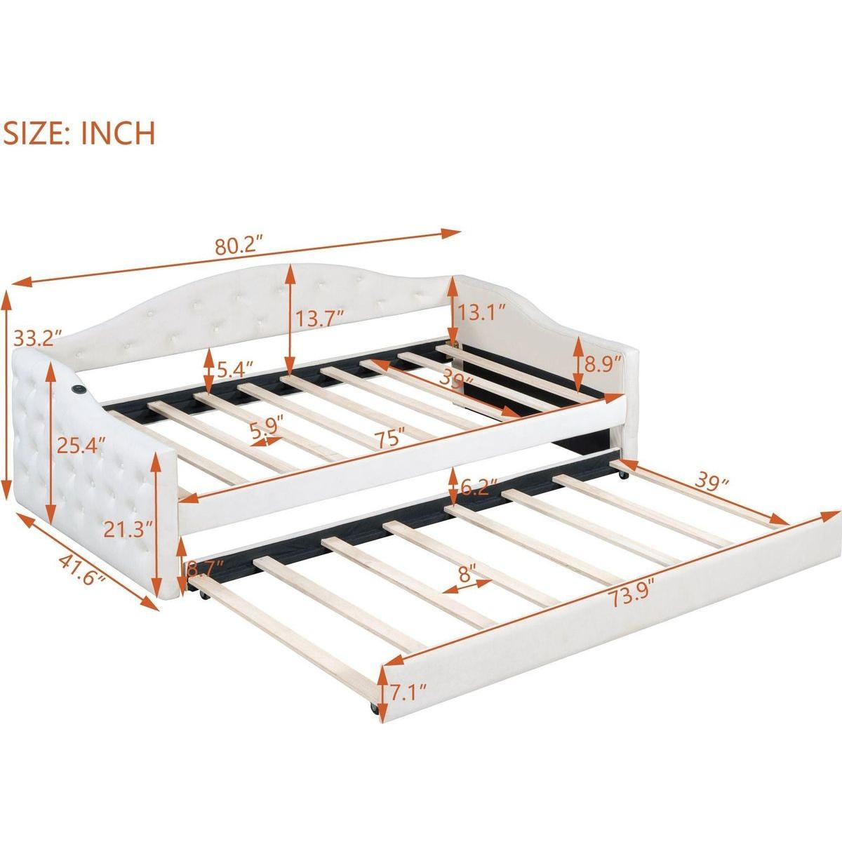 Twin Size Tufted Upholstered Daybed with Trundle, Velvet Sofabed with USB&Type-C Charging Ports,No Box-spring Needed, Beige