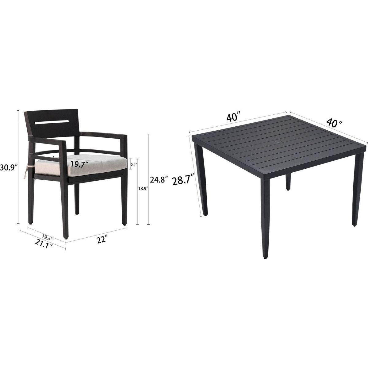 5-Piece Outdoor Patio Aluminum Furniture, Modern Dining Set, including 4 Dining Chairs Sunbrella Fabric Cushioned and 40" Square Dining Table with Umbrella Hole, Ember Black