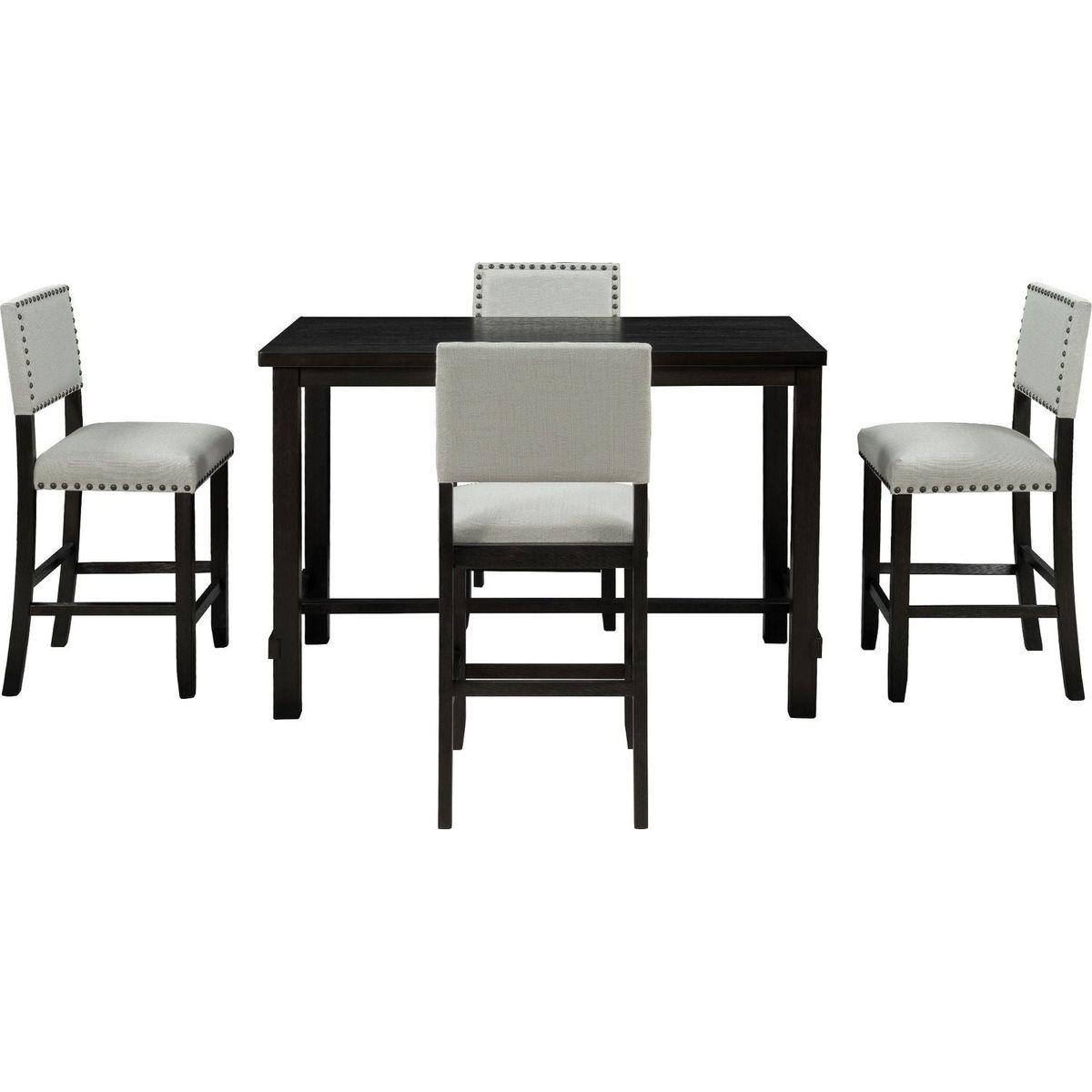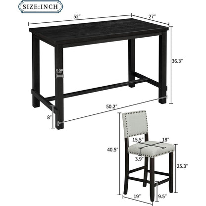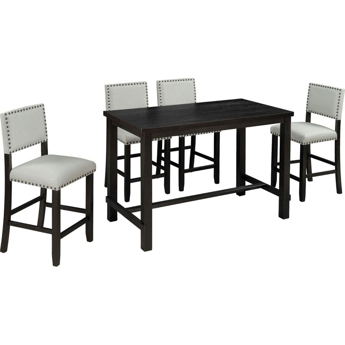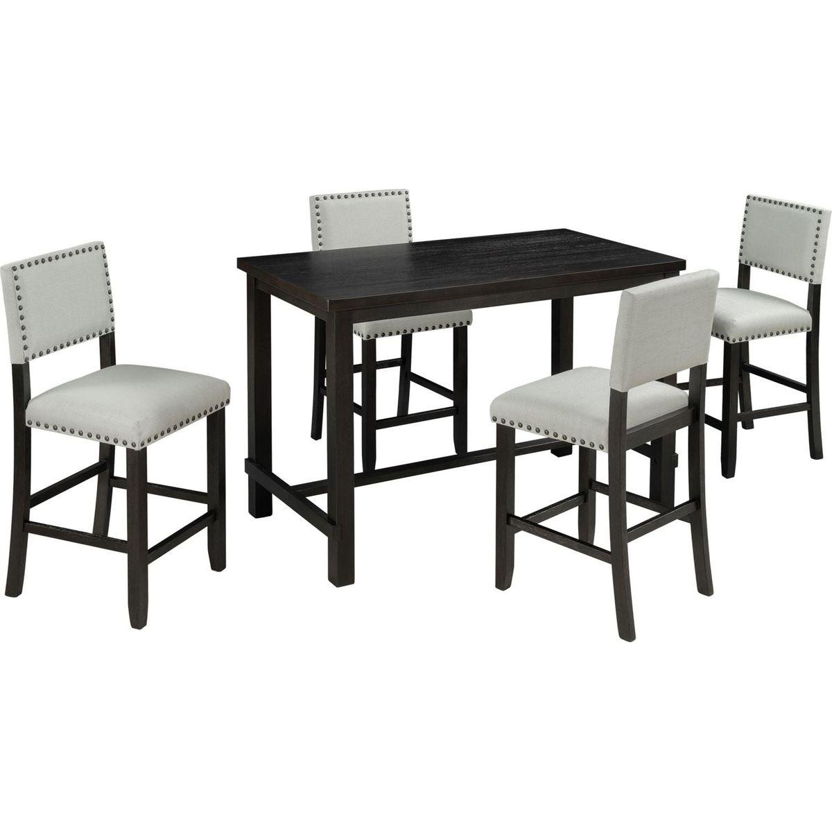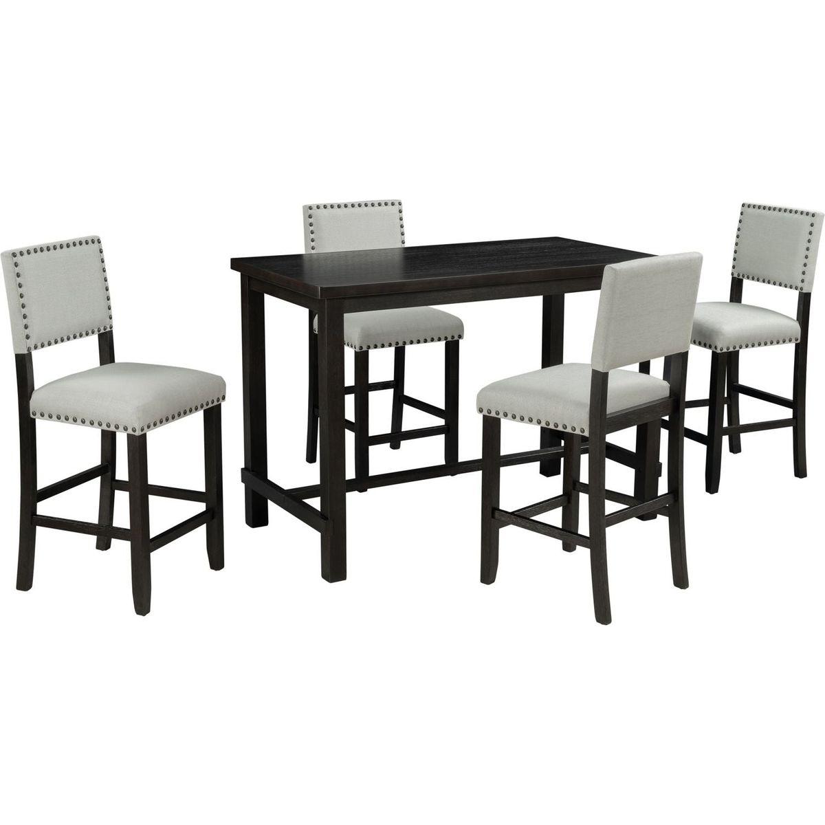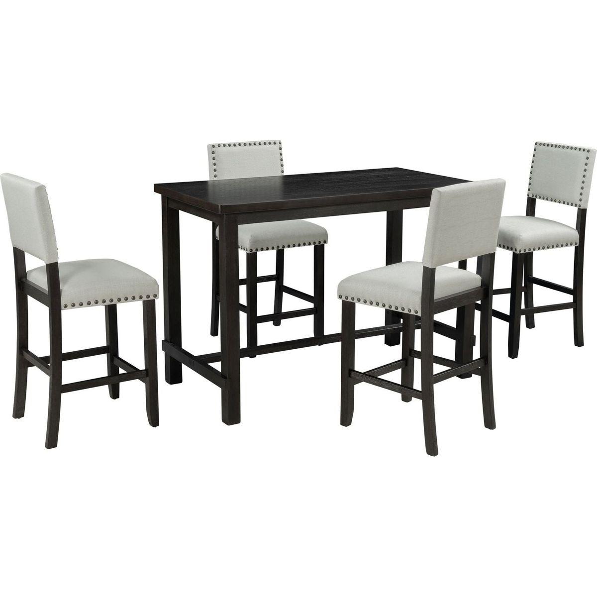 Add an air of elegance to your space with this classy 5-piece dining set including one wooden counter height table and four cushioned chairs with nail head trim in an eye-catching and contemporary espresso and beige color scheme. Table Dimensions: 52"L x 27"W x 36.3"H. Chair Dimensions: 18"L x 19"W x 40.5"H.