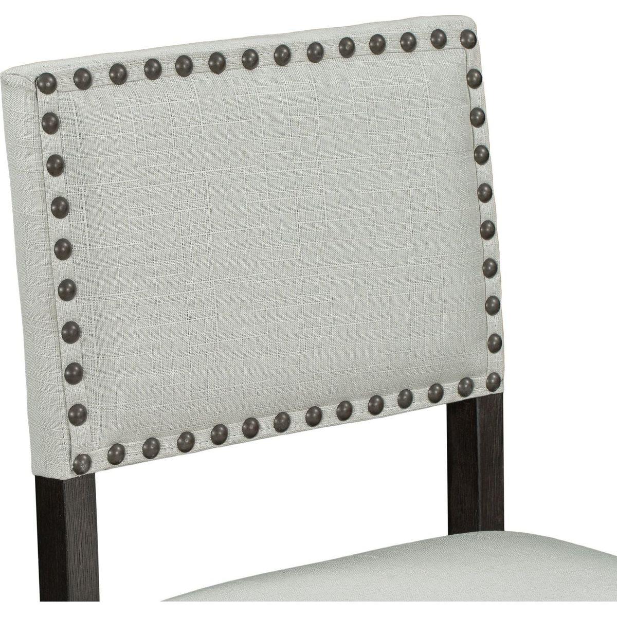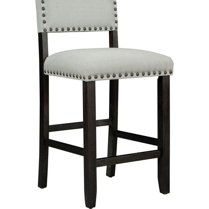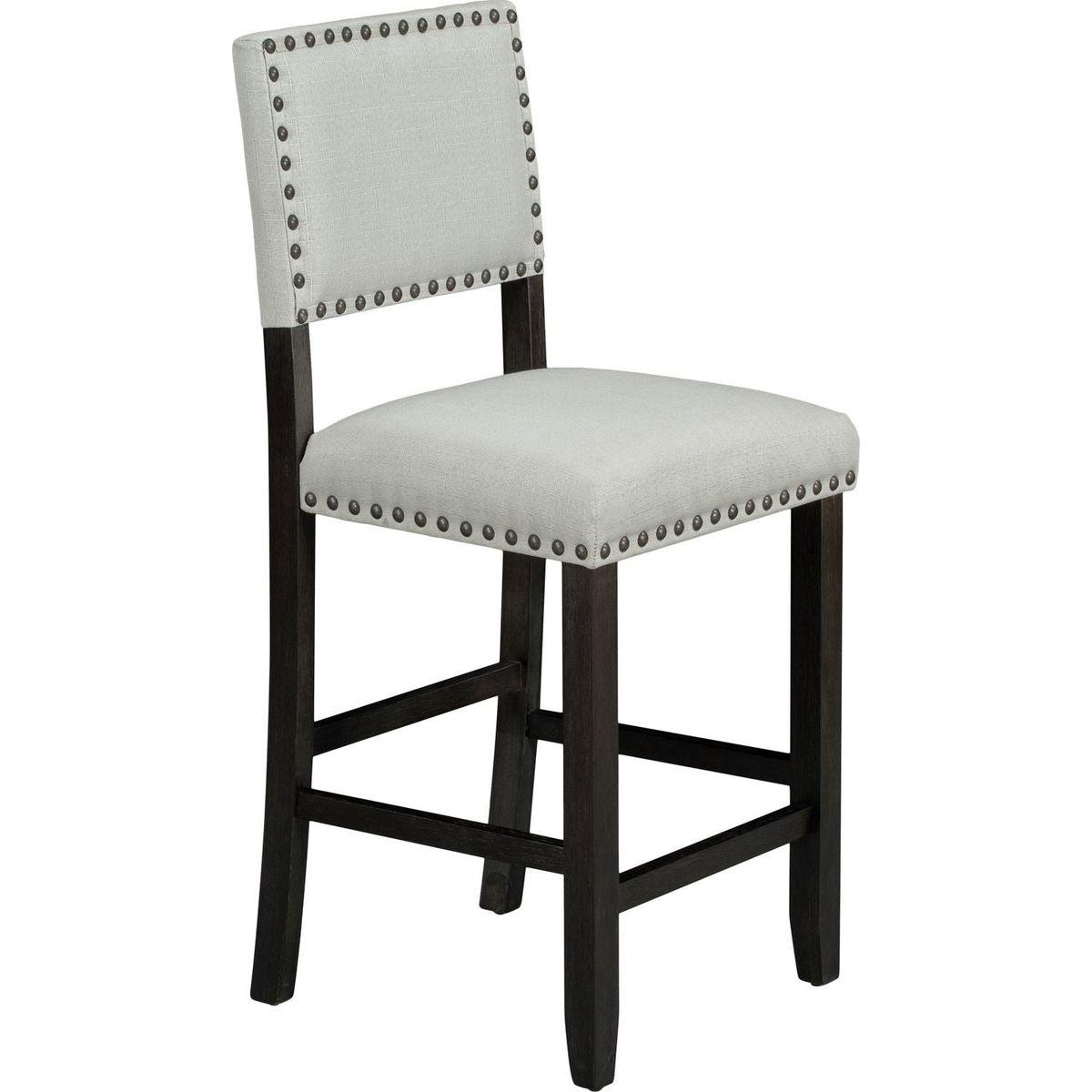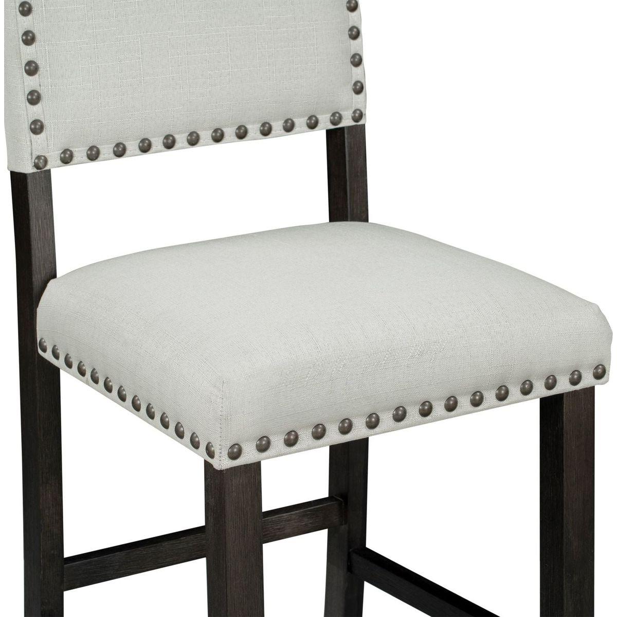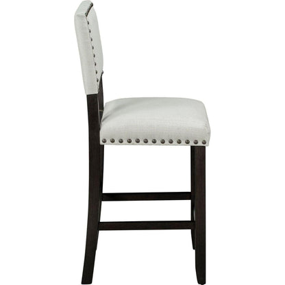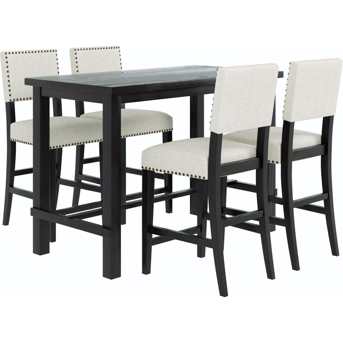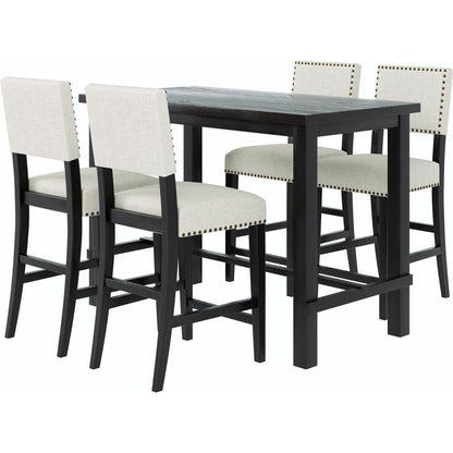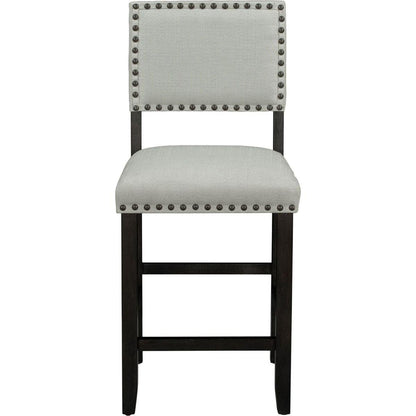 Add an air of elegance to your space with this classy 5-piece dining set including one wooden counter height table and four cushioned chairs with nail head trim in an eye-catching and contemporary espresso and beige color scheme. Table Dimensions: 52"L x 27"W x 36.3"H. Chair Dimensions: 18"L x 19"W x 40.5"H.